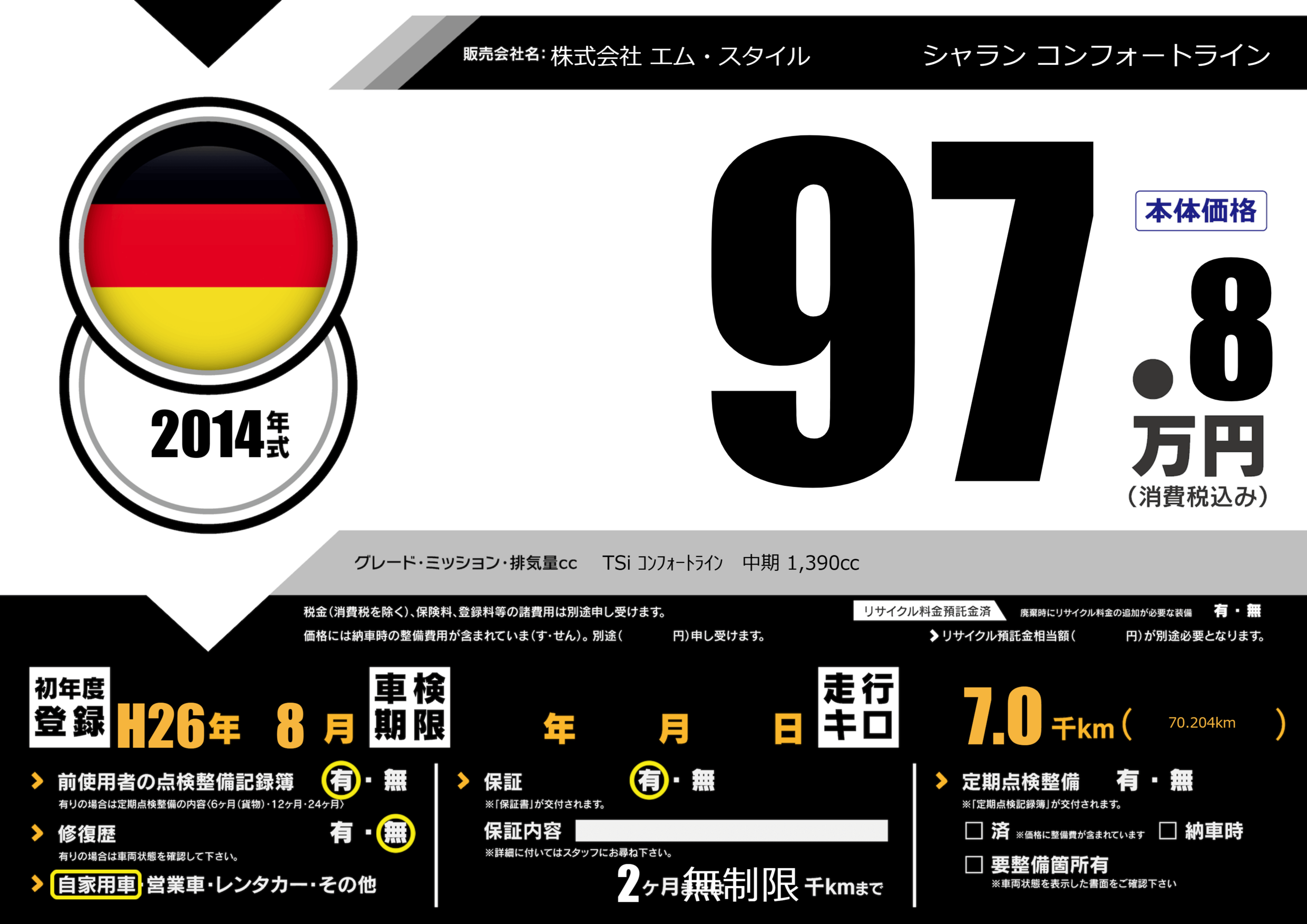 | 車名 | シャラン コンフォートライン | グレード ミッション 排気量 |