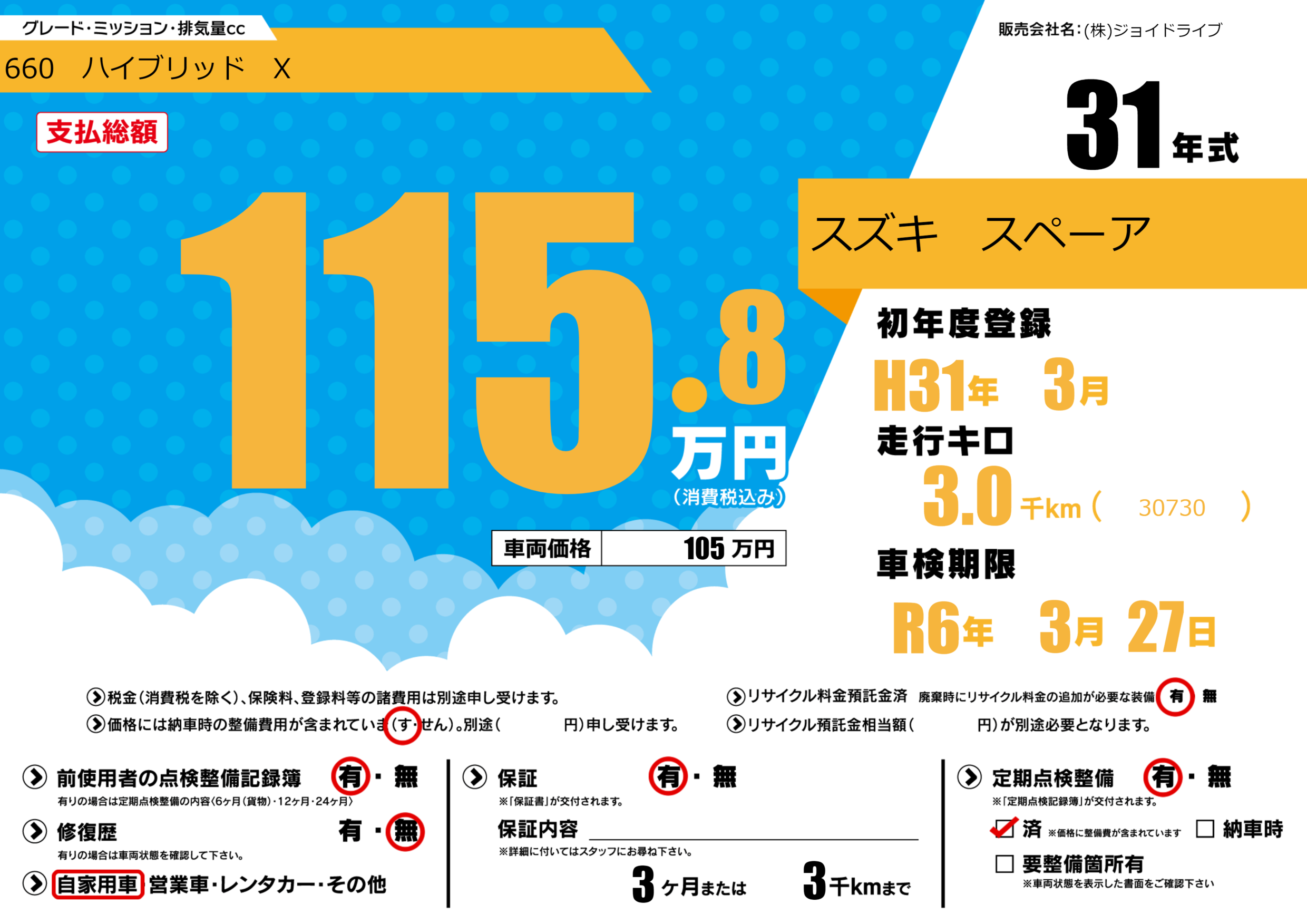 | 定期点検整備 | 定期点検整備あり 定期点検整備済み | ||