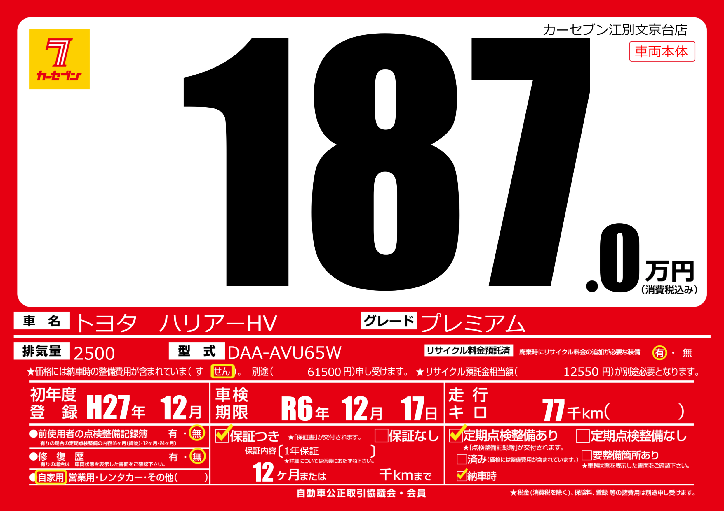 | 車名 | トヨタ ハリアーHV | グレード ミッション 排気量 |