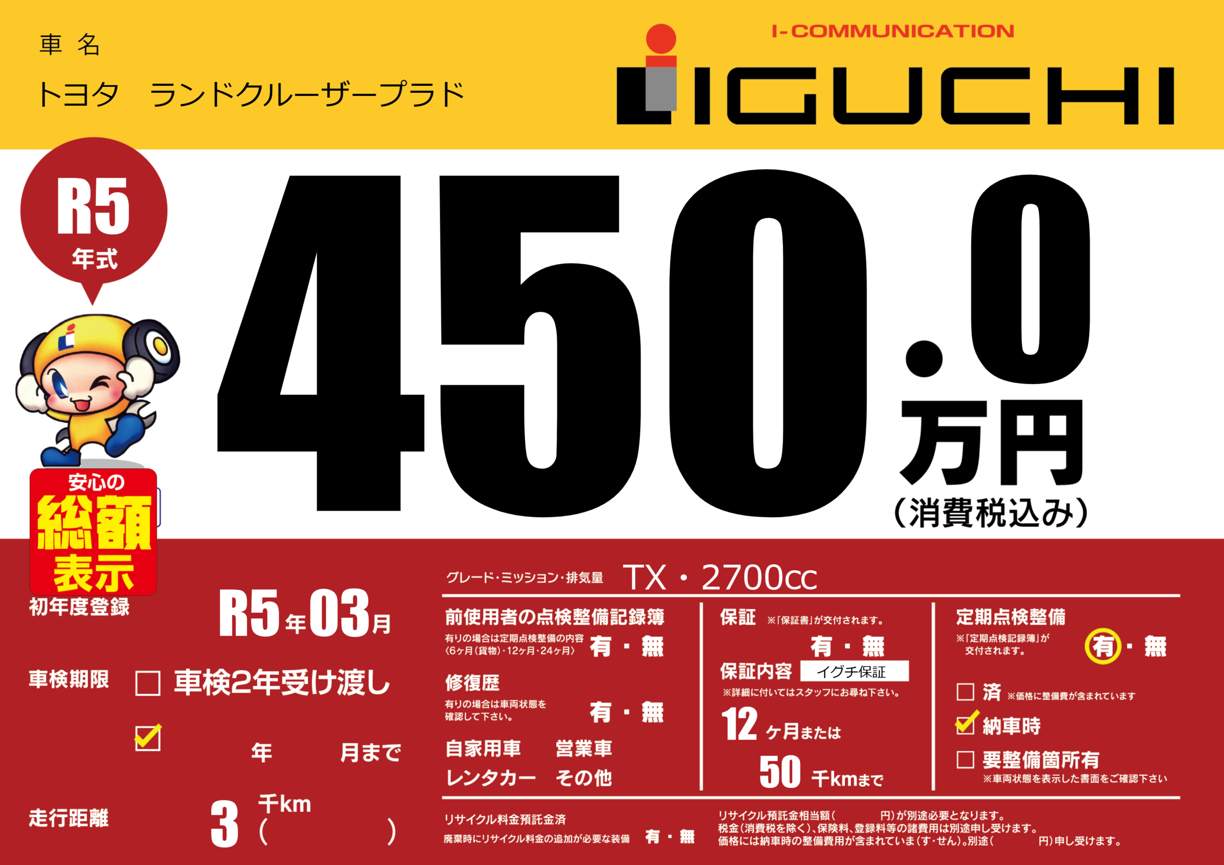 | 車名 | トヨタ ランドクルーザープラド | グレード ミッション 排気量 |