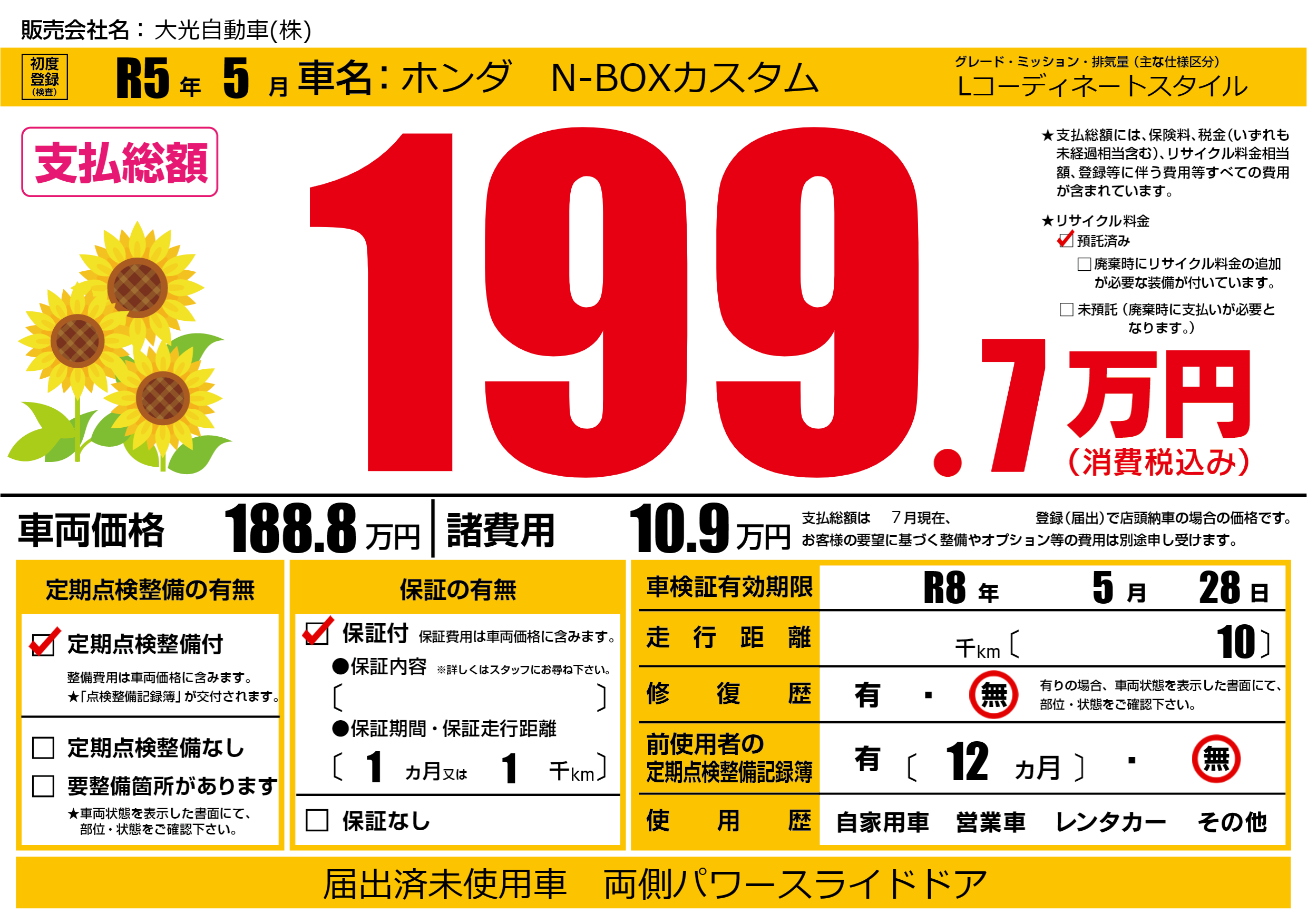 | 車名 | ホンダ N-BOXカスタム | グレード ミッション 排気量 |