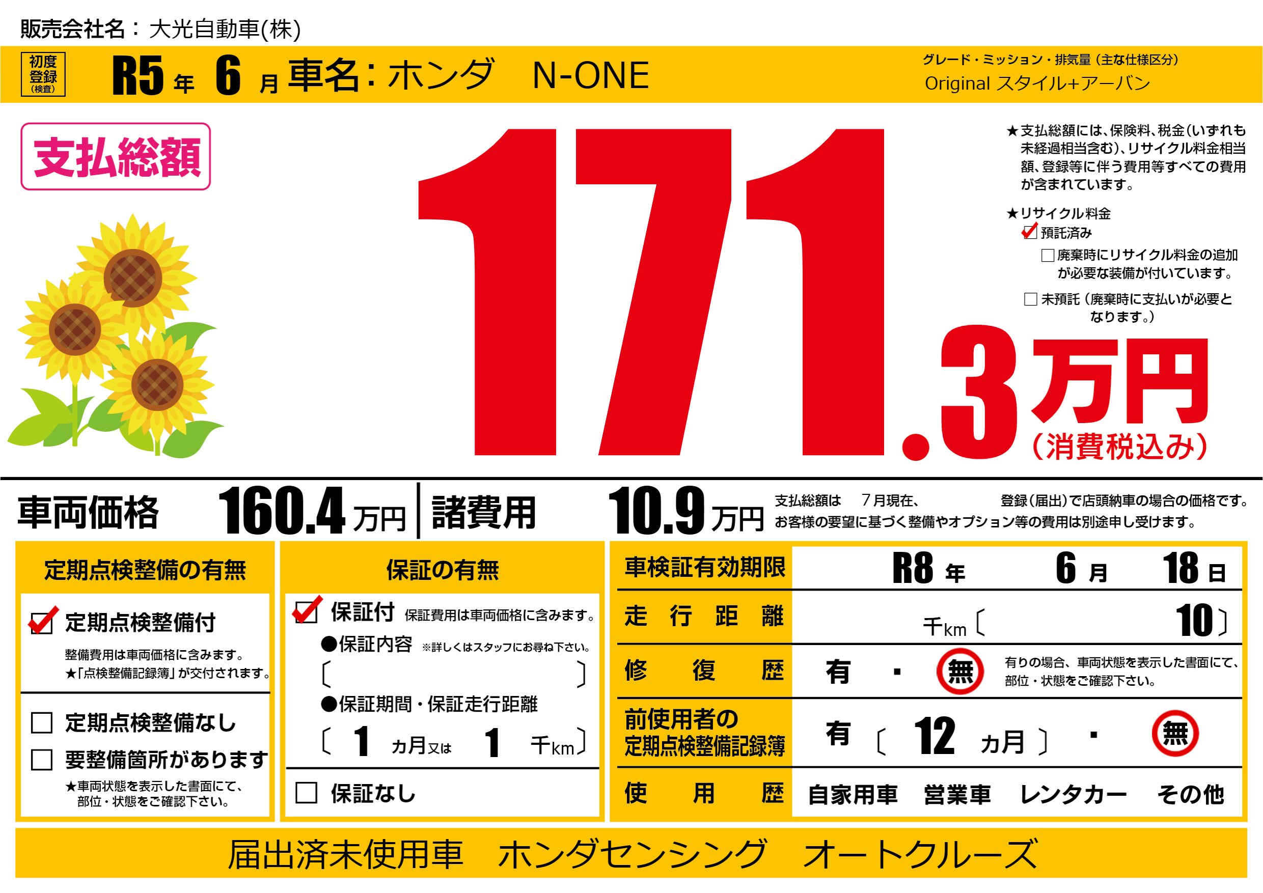 | 車名 | ホンダ N-ONE | グレード ミッション 排気量 |