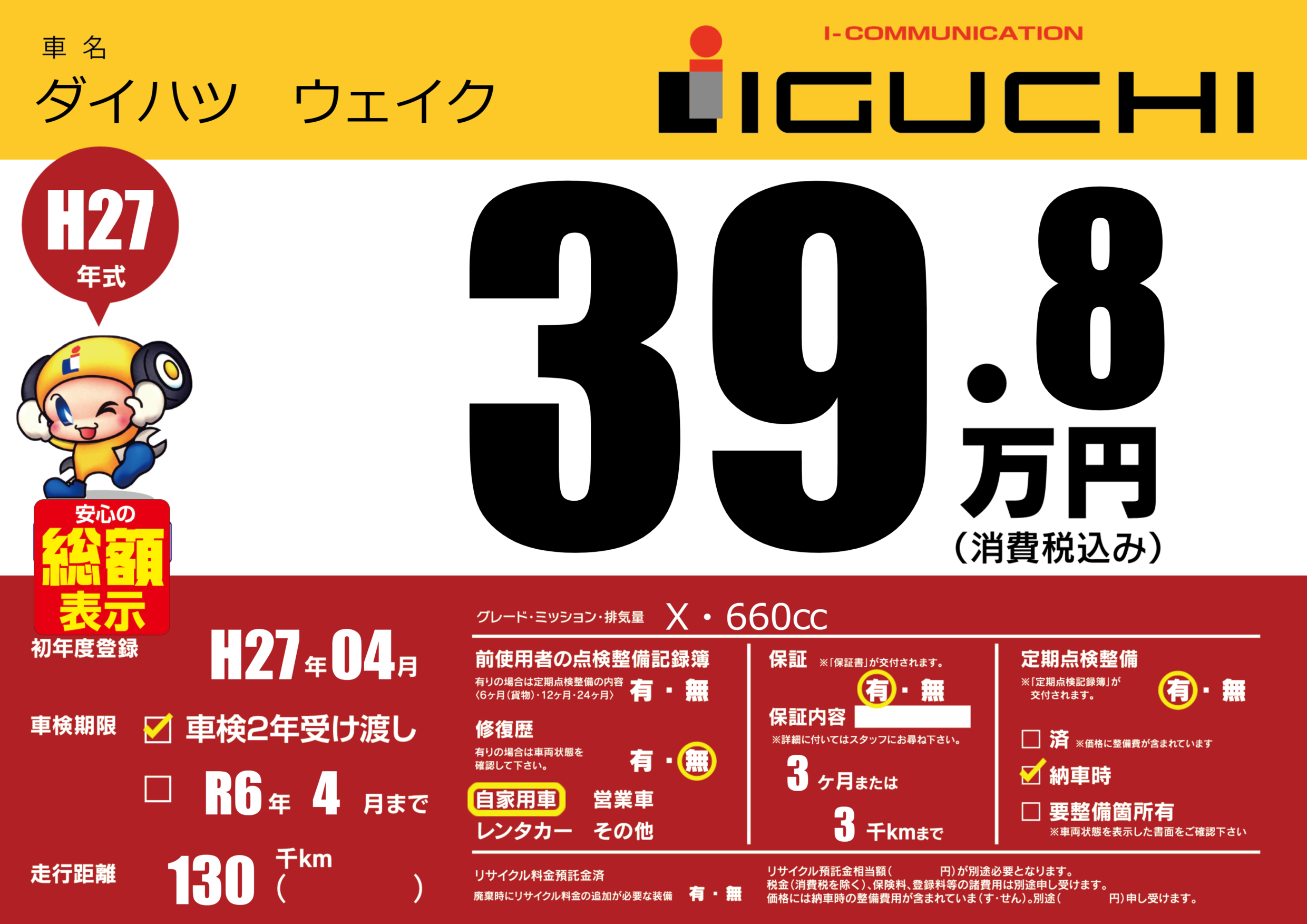 | 車名 | ダイハツ ウェイク | グレード ミッション 排気量 |