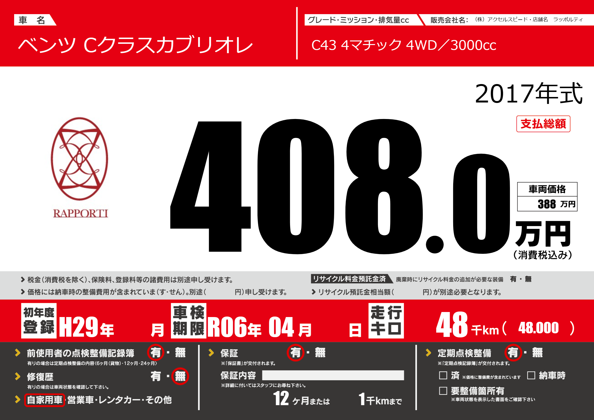 | 車名 | ベンツ Cクラスカブリオレ | グレード ミッション 排気量 |