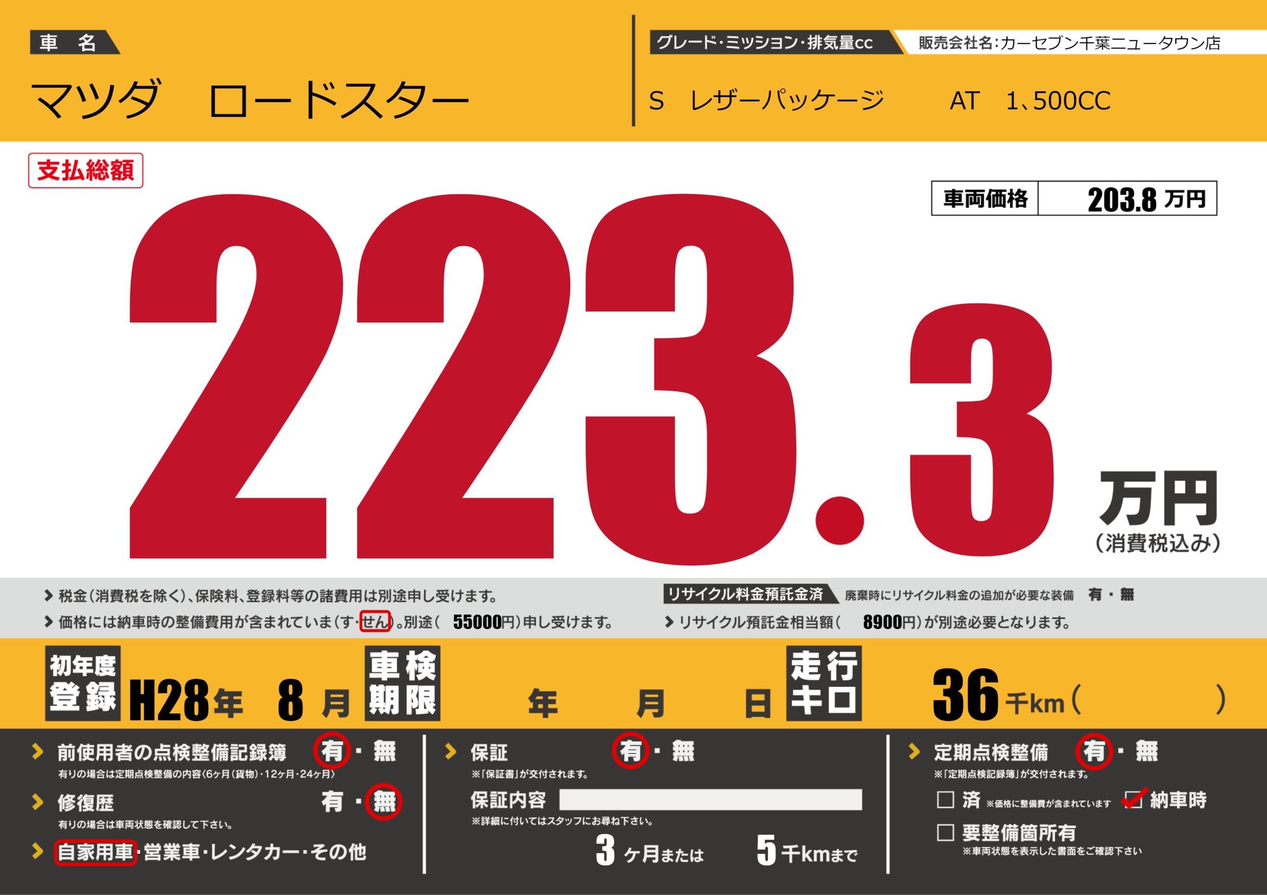 | 車名 | マツダ ロードスター | グレード ミッション 排気量 |