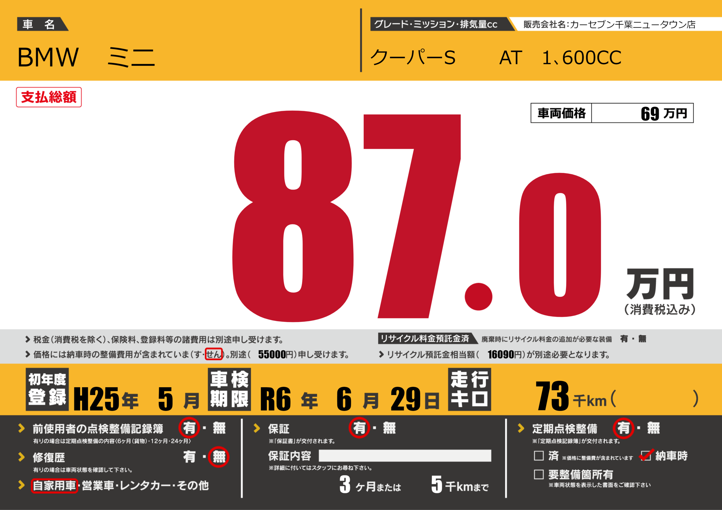 | 車名 | BMW ミニ | グレード ミッション 排気量 |