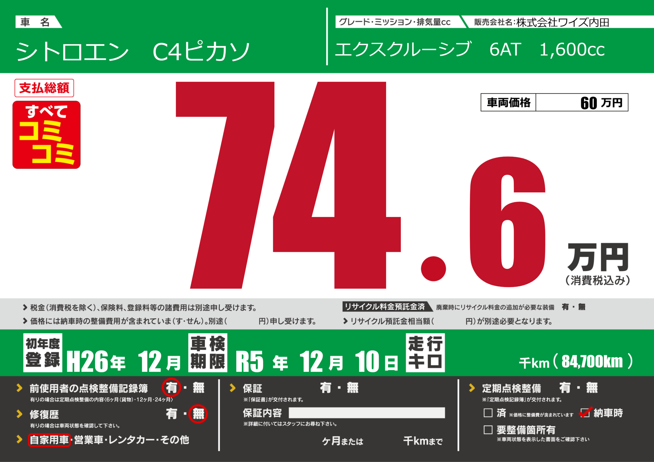 | 車名 | シトロエン C4ピカソ | グレード ミッション 排気量 |
