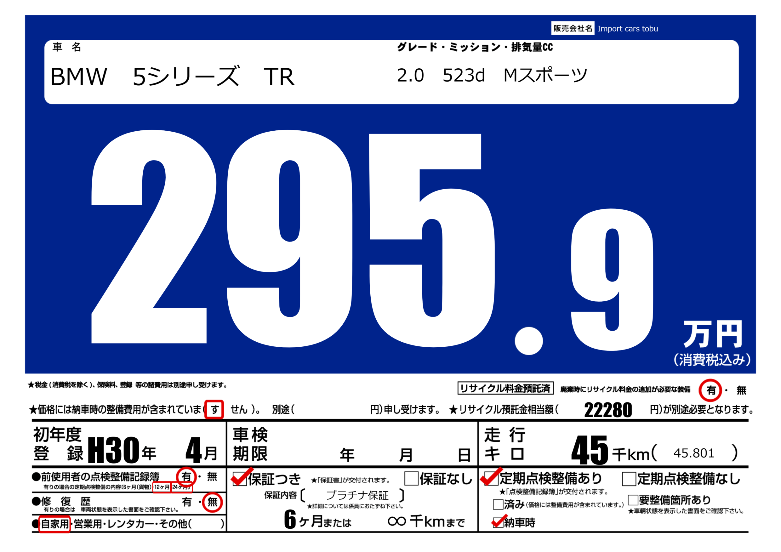 | 車名 | BMW 5シリーズ TR | グレード ミッション 排気量 |