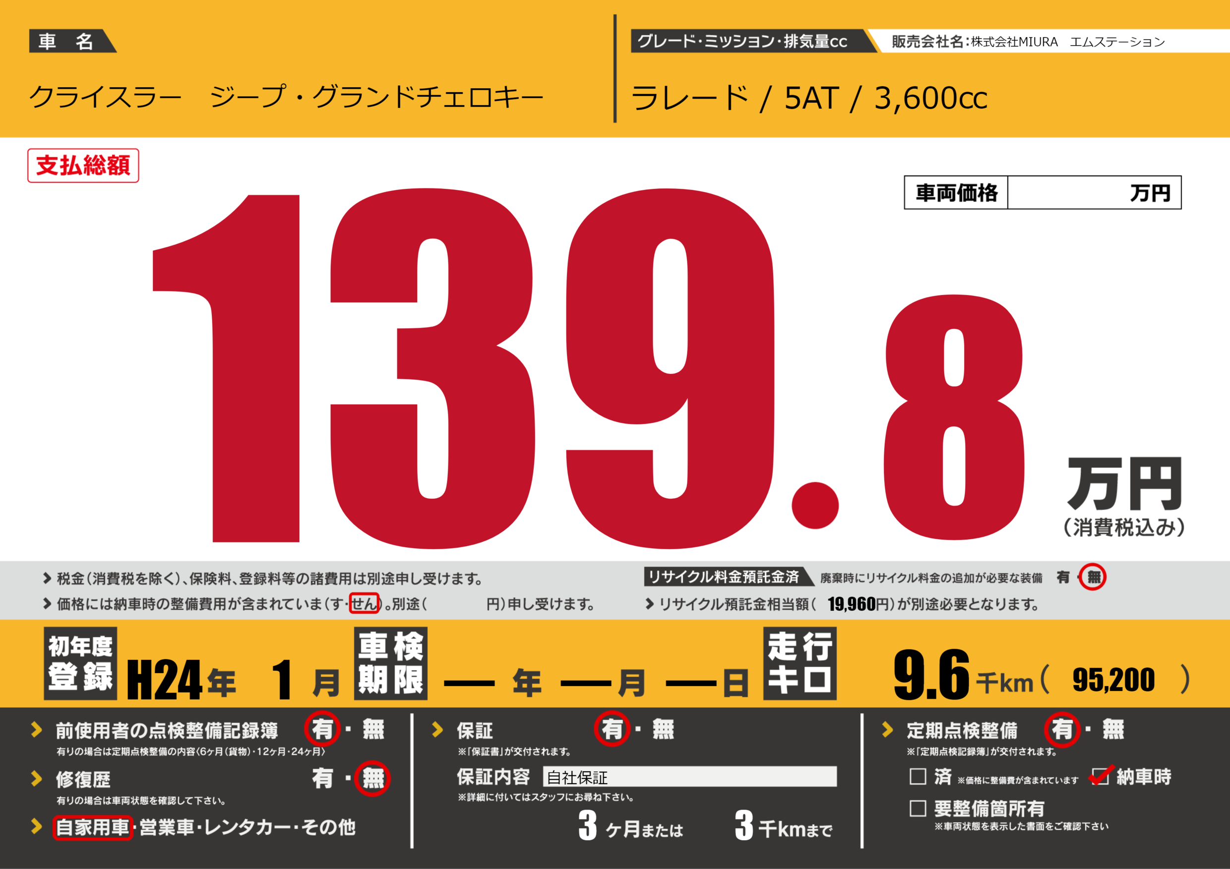 | 車名 | クライスラー ジープ・グランドチェロキー | グレード ミッション 排気量 |