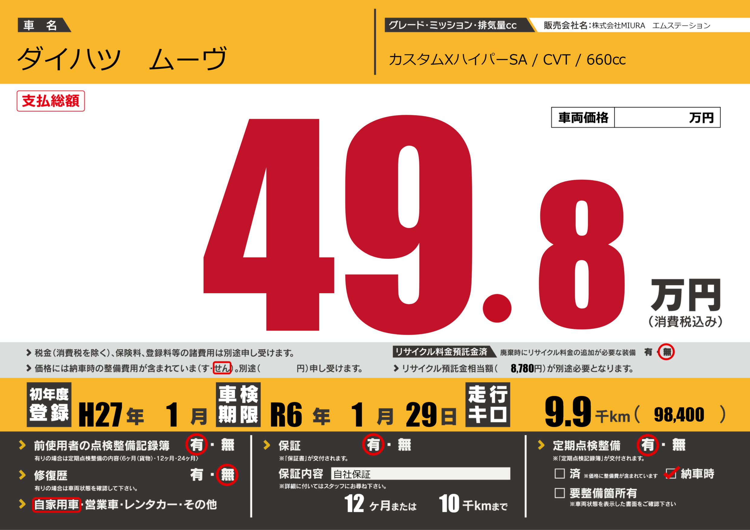 保証付き 保証内容(自社保証) 12ヶ月または(10)千kmまで |