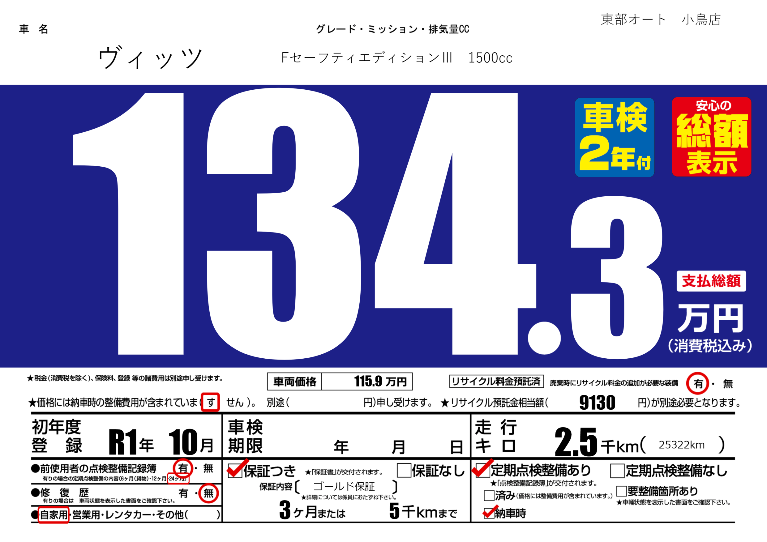 保証付き 保証内容( ゴールド保証) 3ヶ月または5千km |