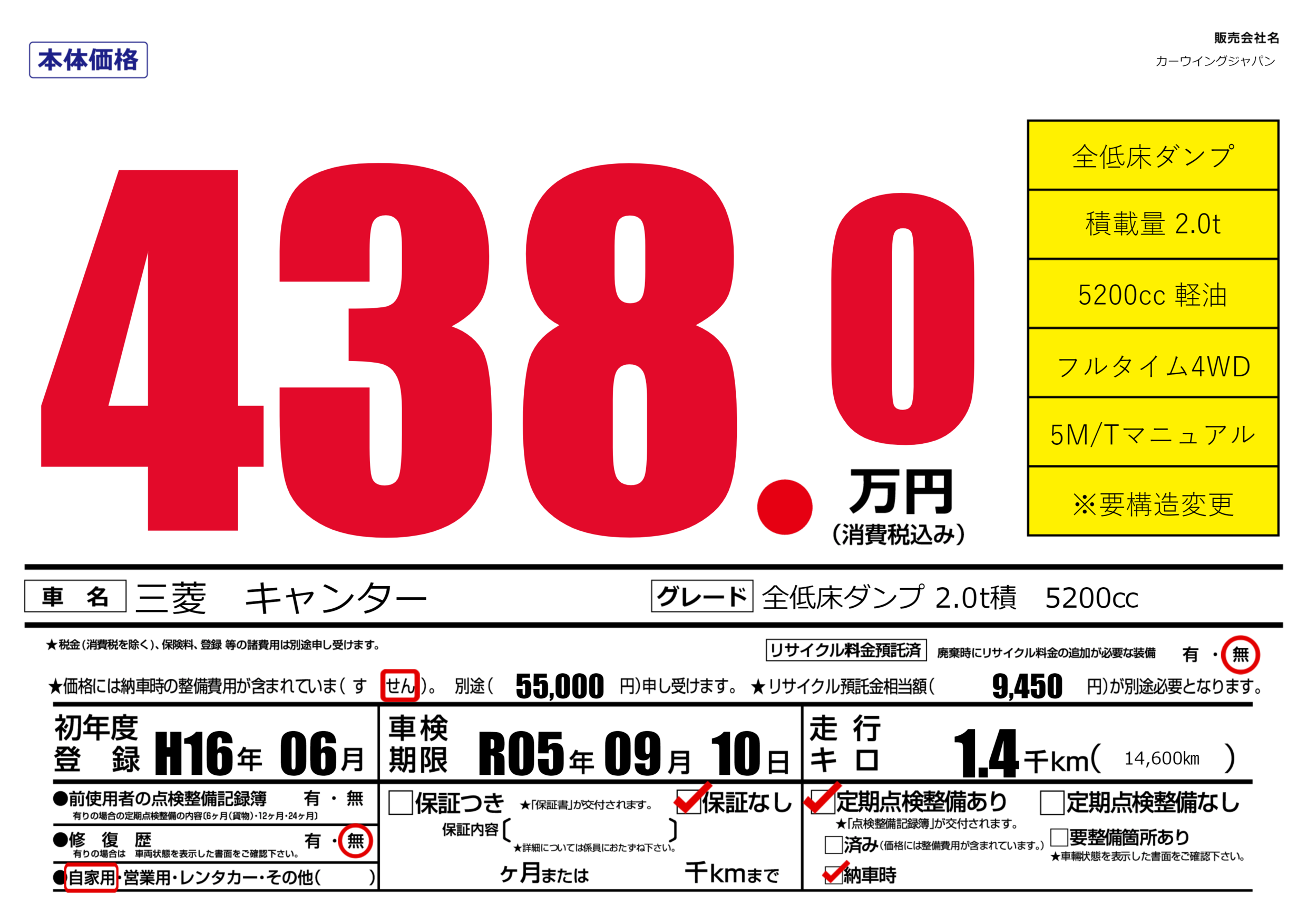 | 車名 | 三菱 キャンター | グレード ミッション 排気量 |