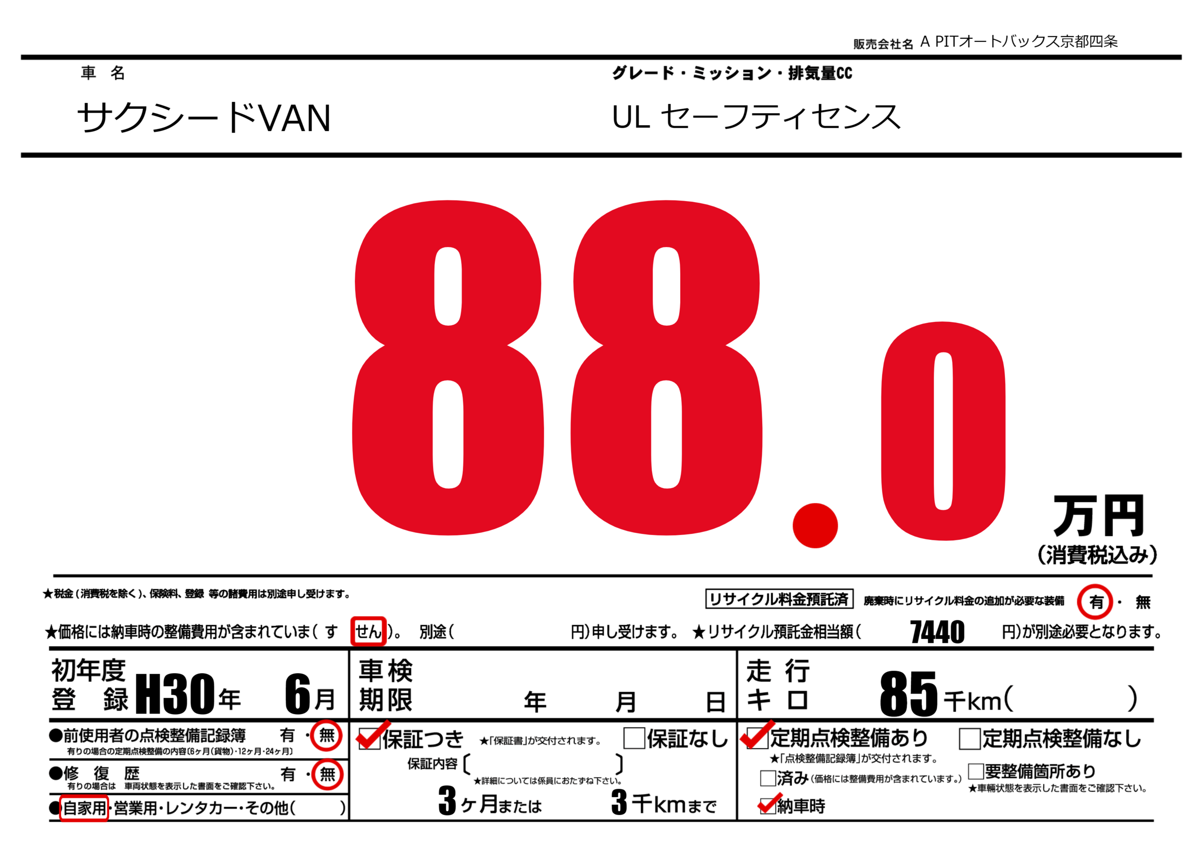 保証なし 保証内容(---) 3ヶ月または(3)千kmまで |