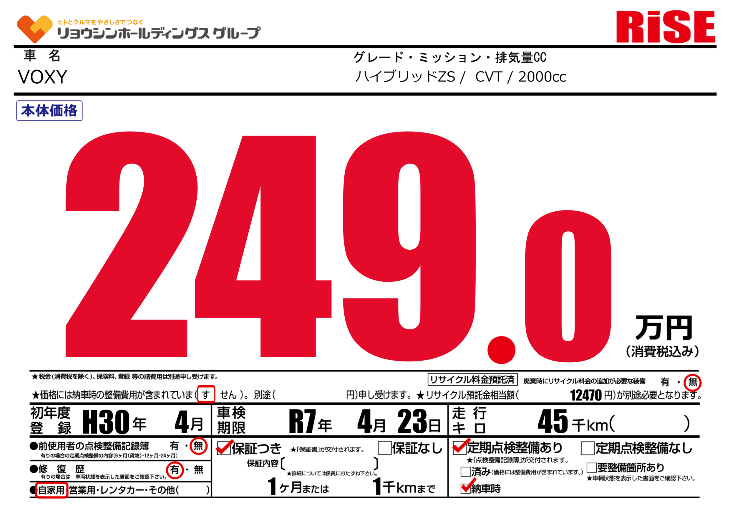 | 車名 | VOXY | グレード ミッション 排気量 |