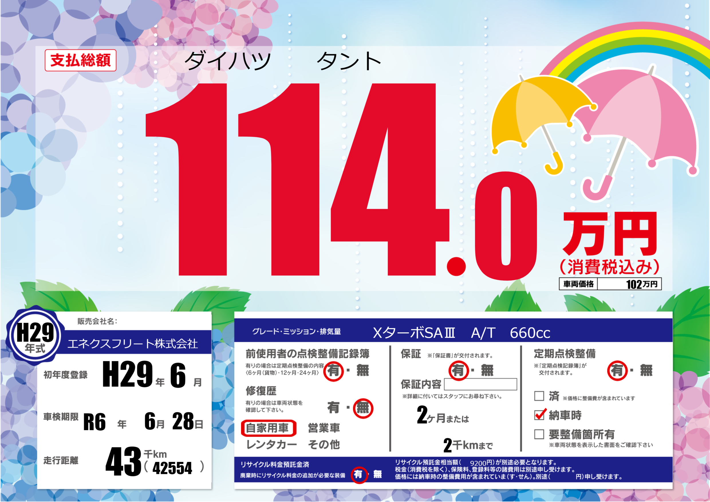 | 車名 | ダイハツ タント | グレード ミッション 排気量 |