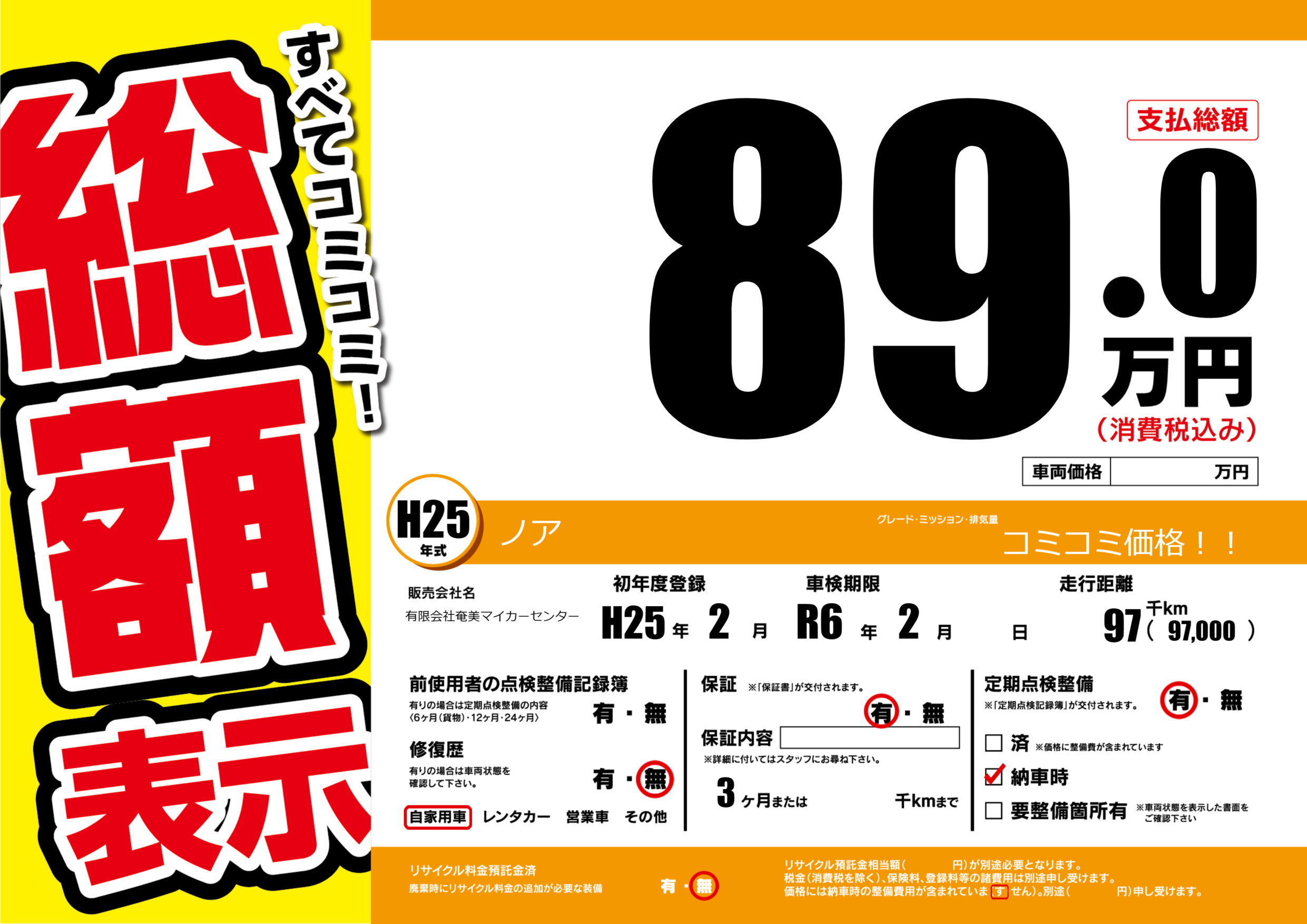 | 定期点検整備 | 定期点検整備あり 納車時あり | ||