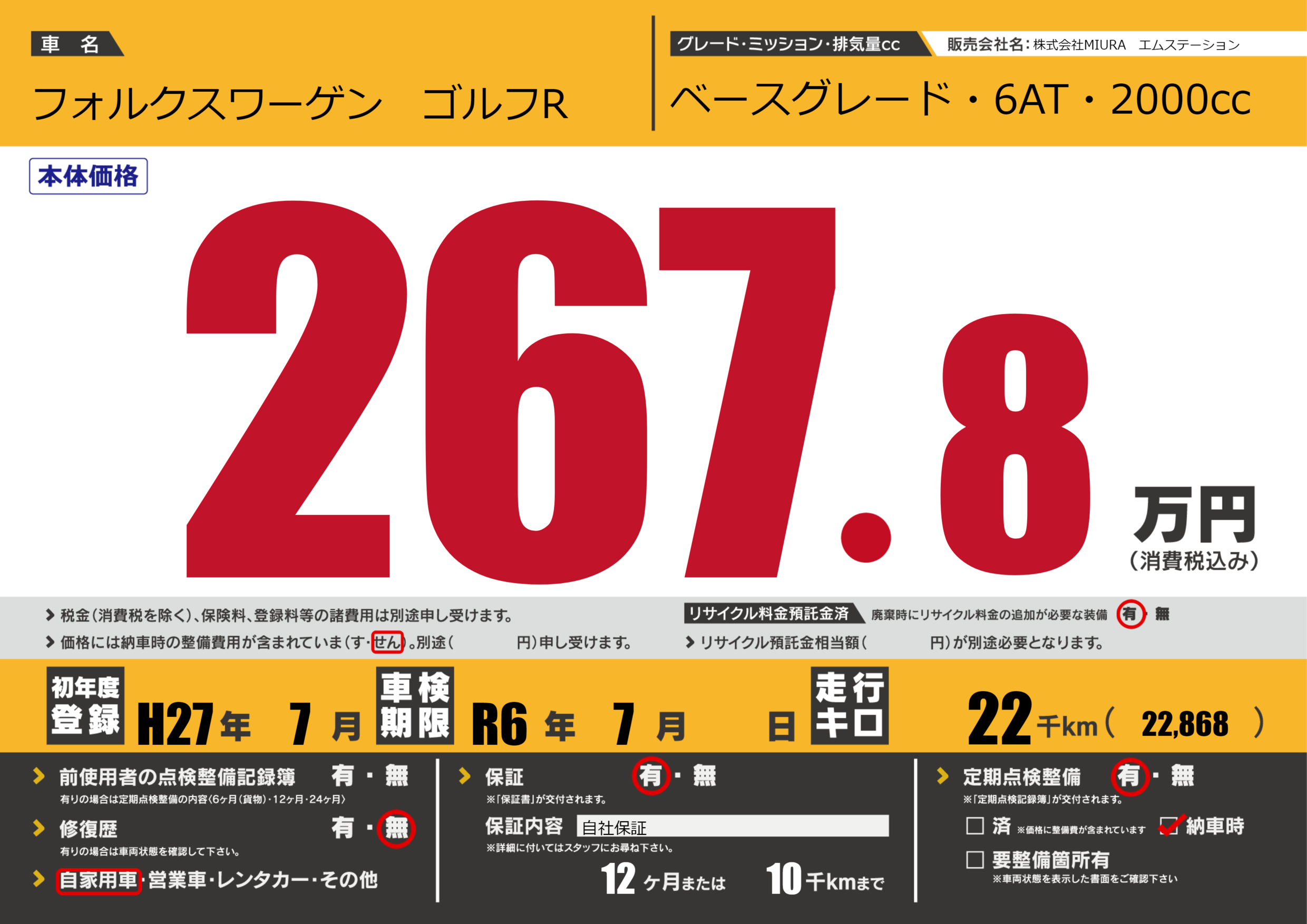 保証付き 保証内容(自社保証) 12ヶ月または10千km |