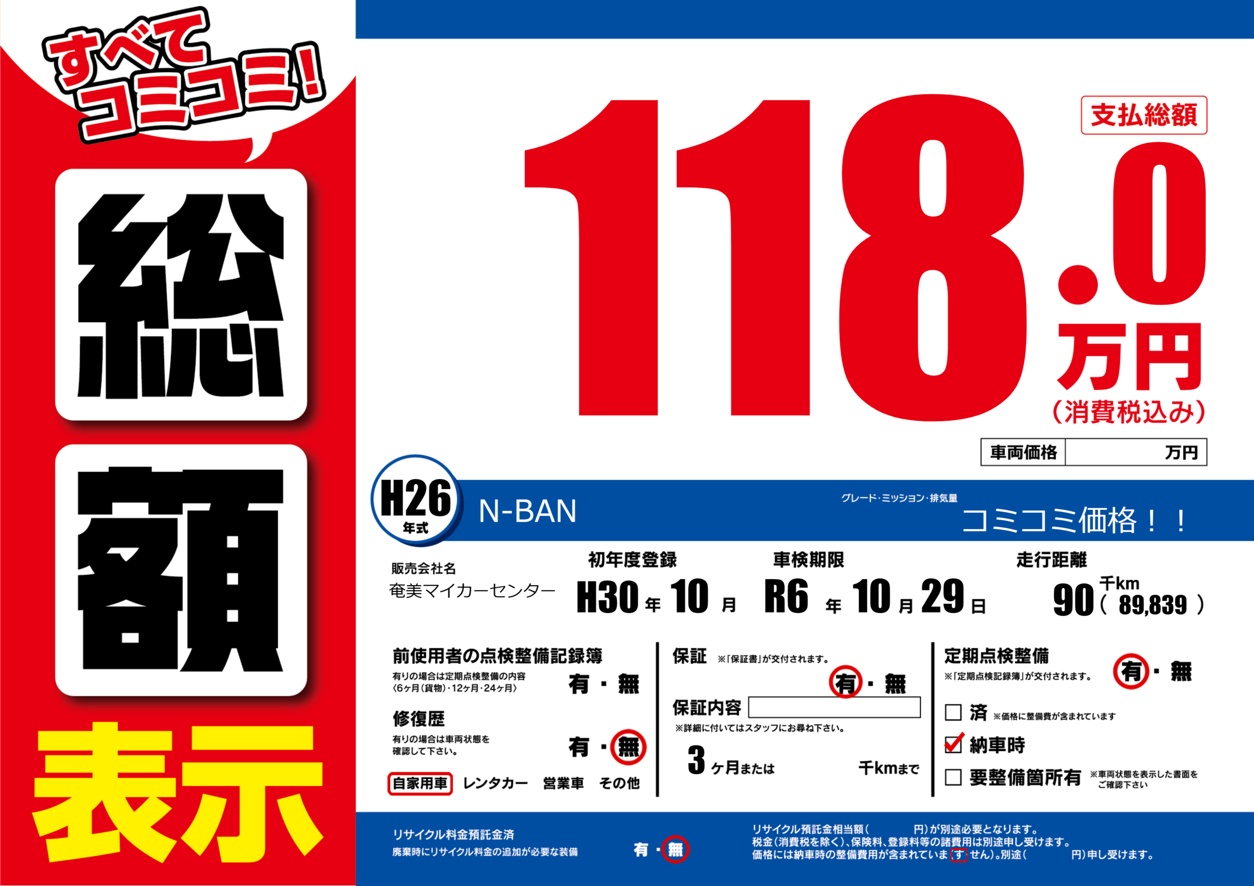 | 定期点検整備 | 定期点検整備あり 納車時あり | ||