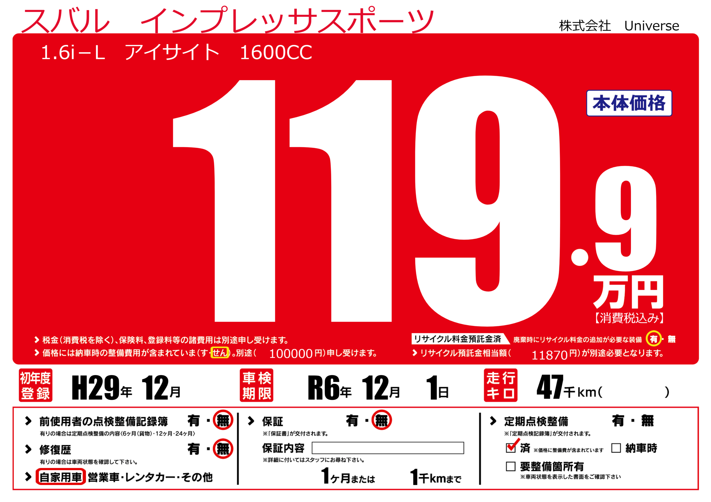 | 車名 | スバル インプレッサスポーツ | グレード ミッション 排気量 |