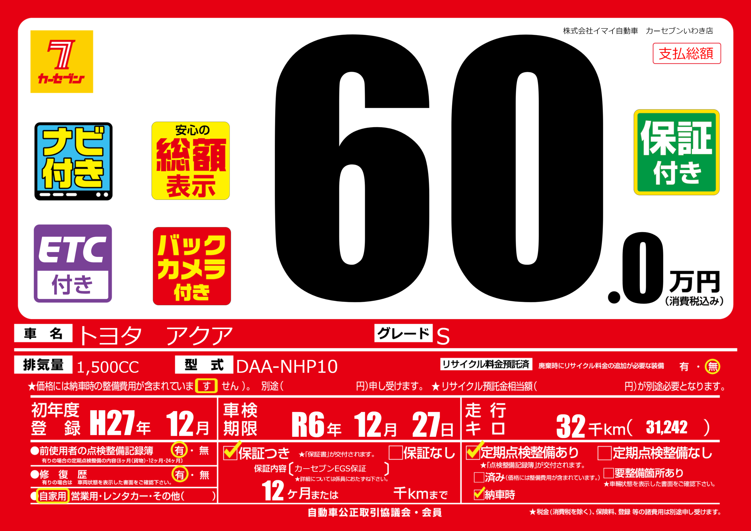 | 車名 | トヨタ アクア | グレード ミッション 排気量 |