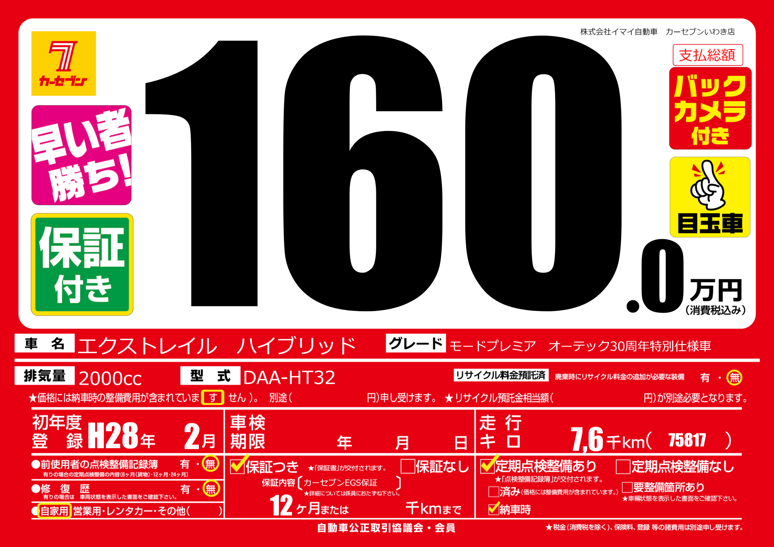 | 車名 | エクストレイル ハイブリッド | グレード ミッション 排気量 |