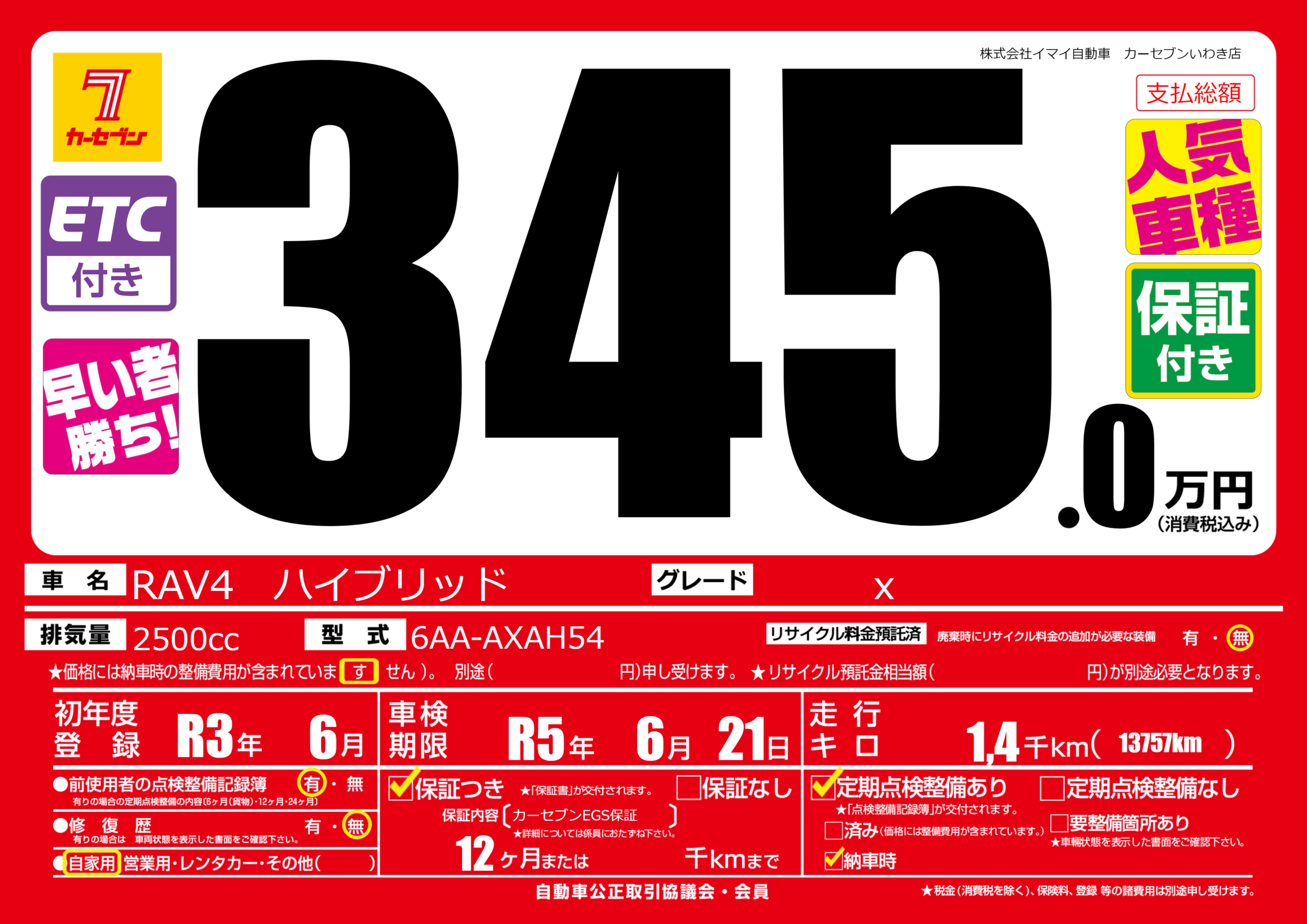 | 車検制限 | R5年 6月 21日 | ||