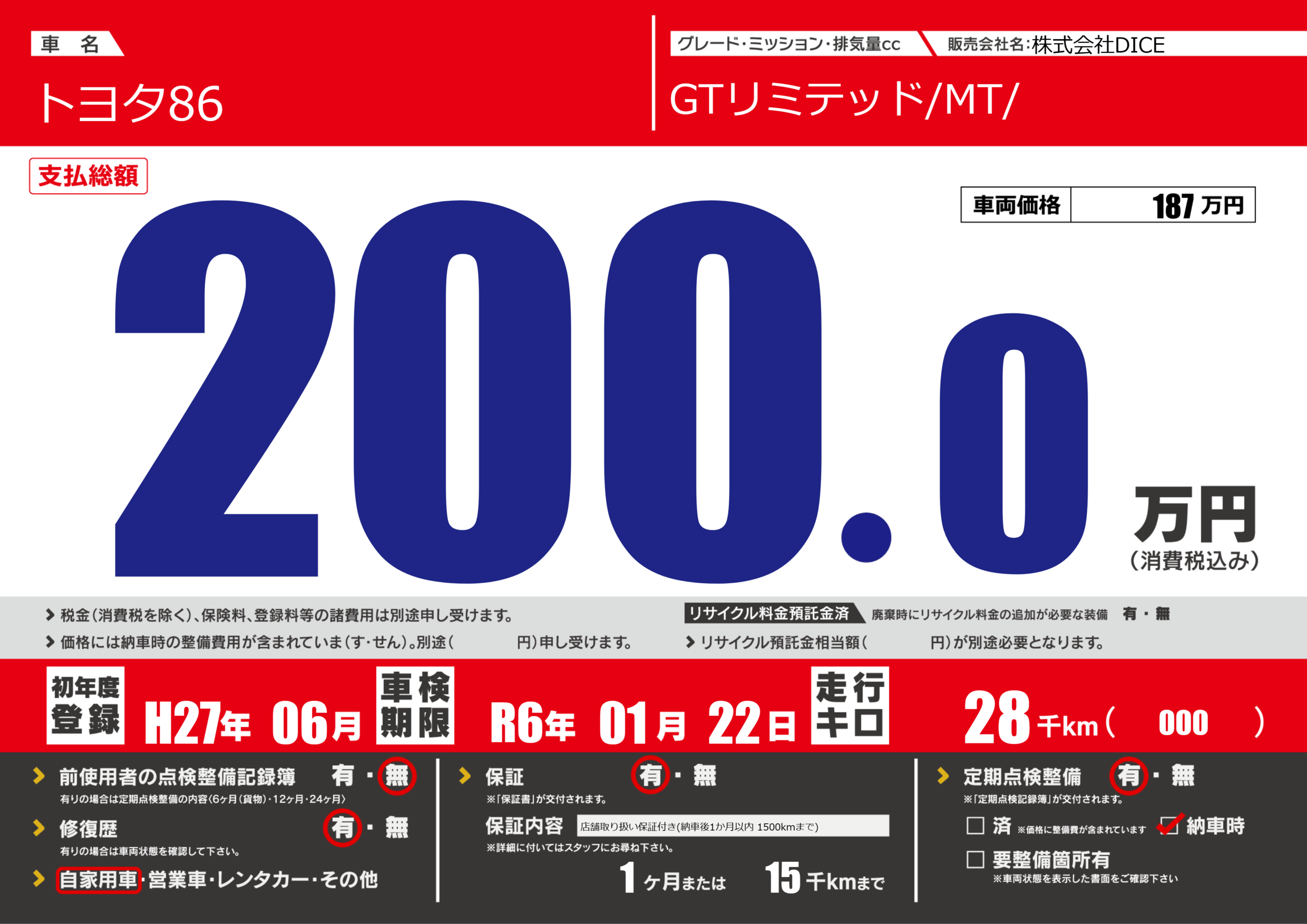 | 車名 | トヨタ86 | グレード ミッション 排気量 |