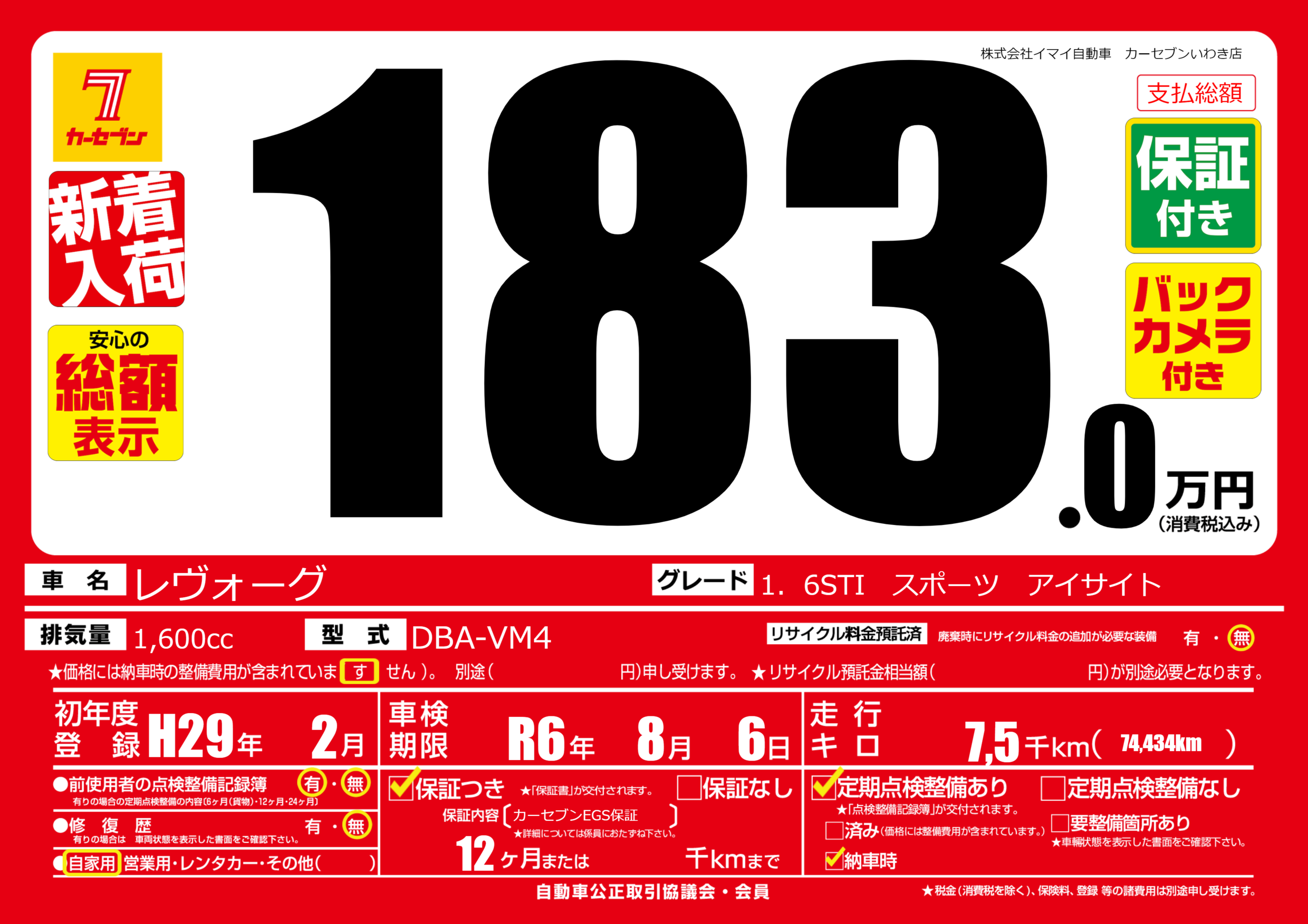 | 車名 | レヴォーグ | グレード ミッション 排気量 |