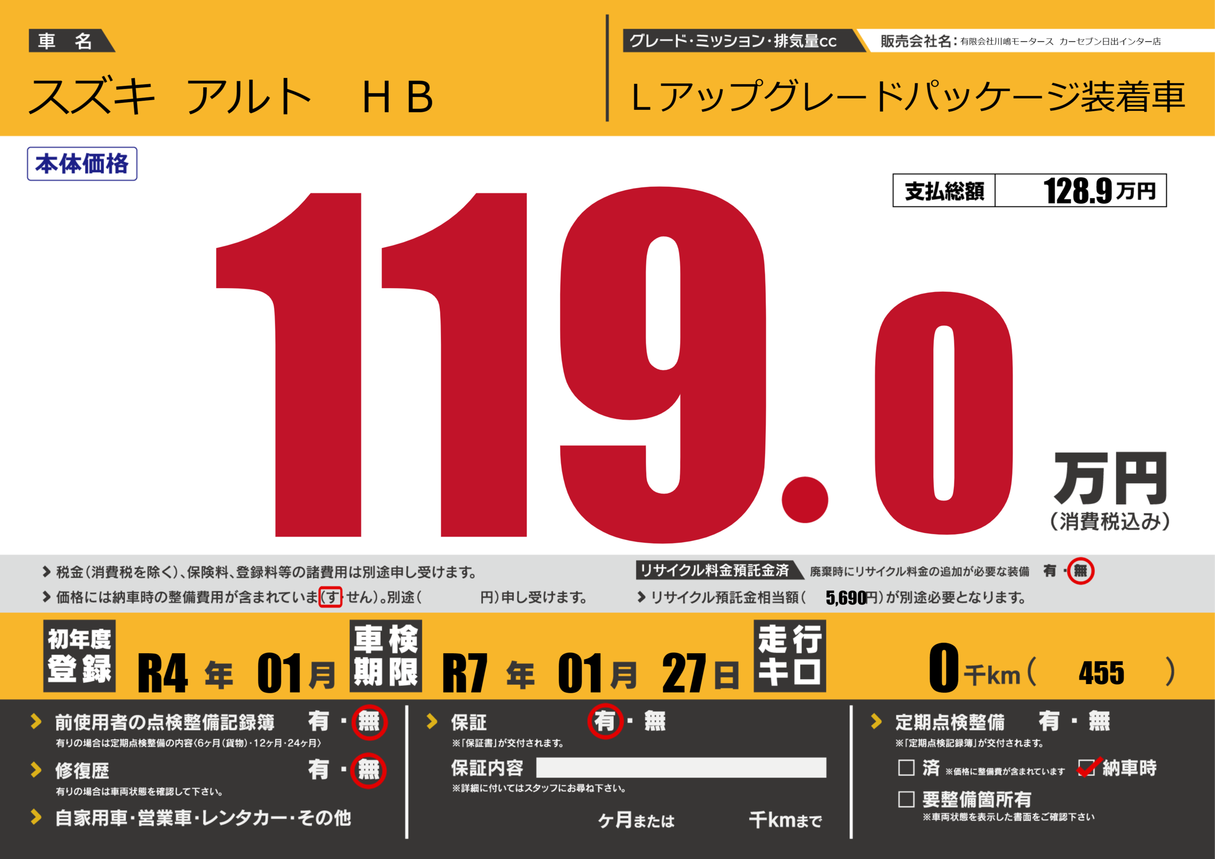 | 車名 | スズキ アルト HB | グレード ミッション 排気量 |
