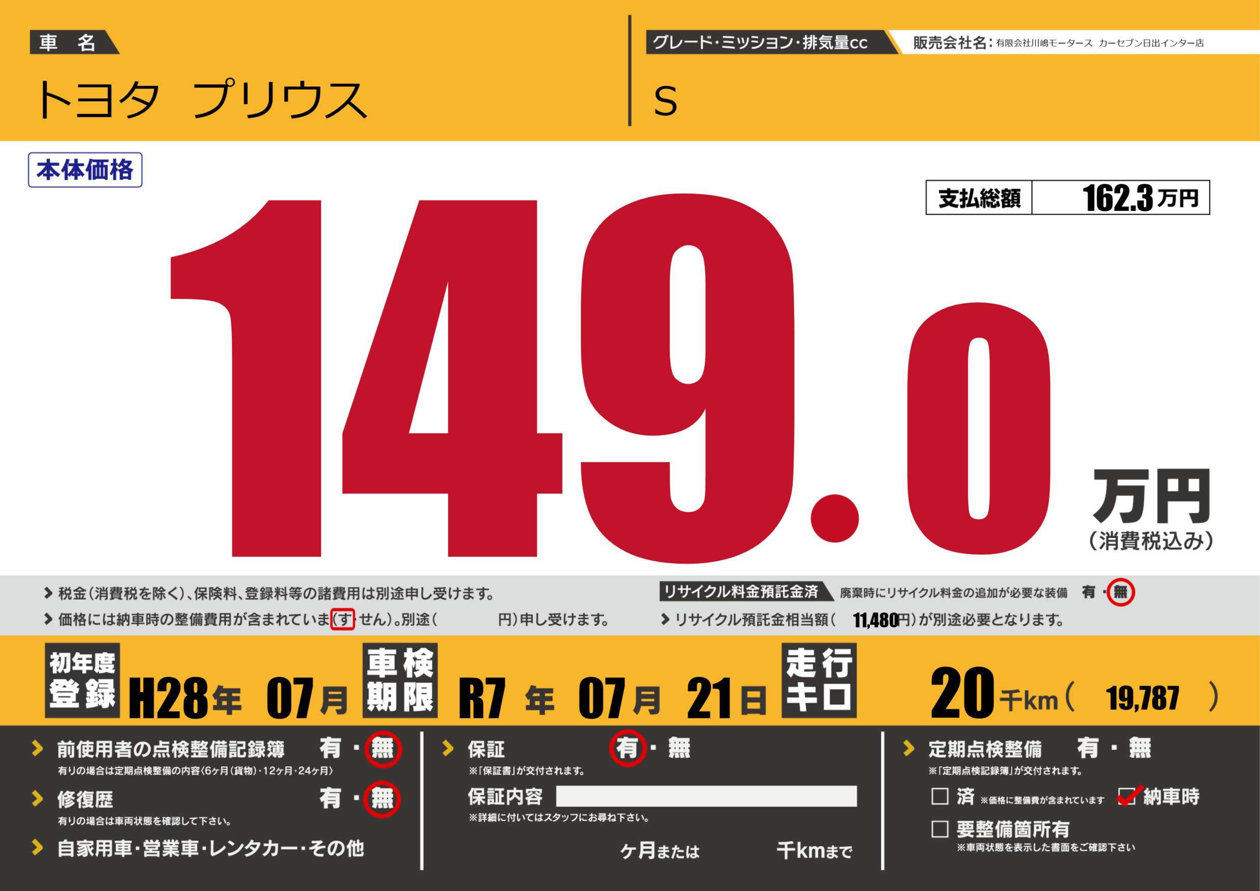 | 車名 | トヨタ プリウス | グレード ミッション 排気量 |