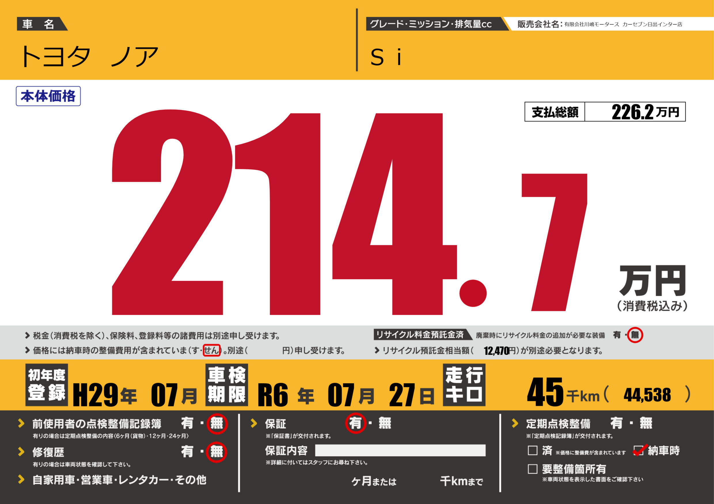 | 車名 | トヨタ ノア | グレード ミッション 排気量 |