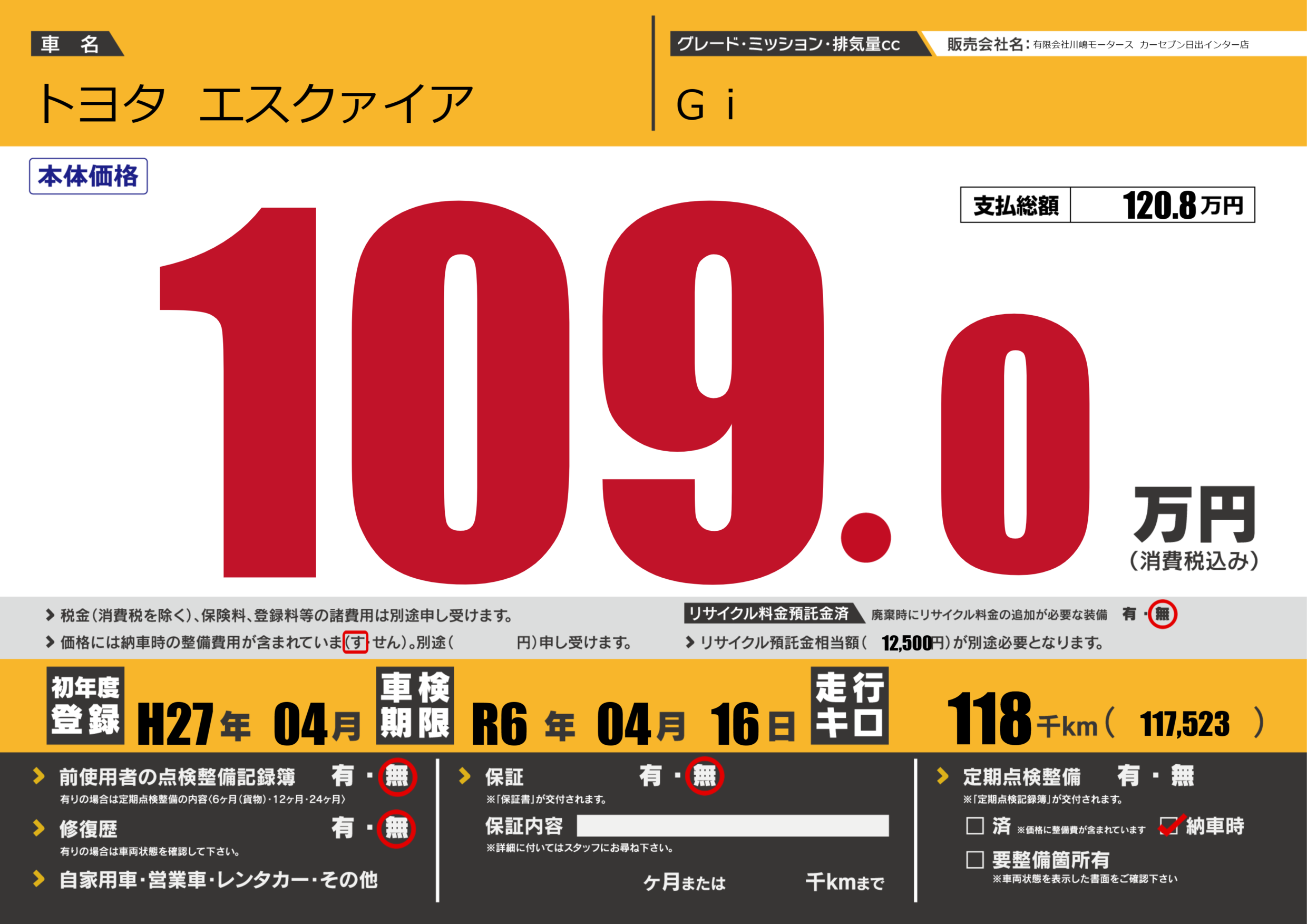 | 定期点検整備 | 納車時あり | ||