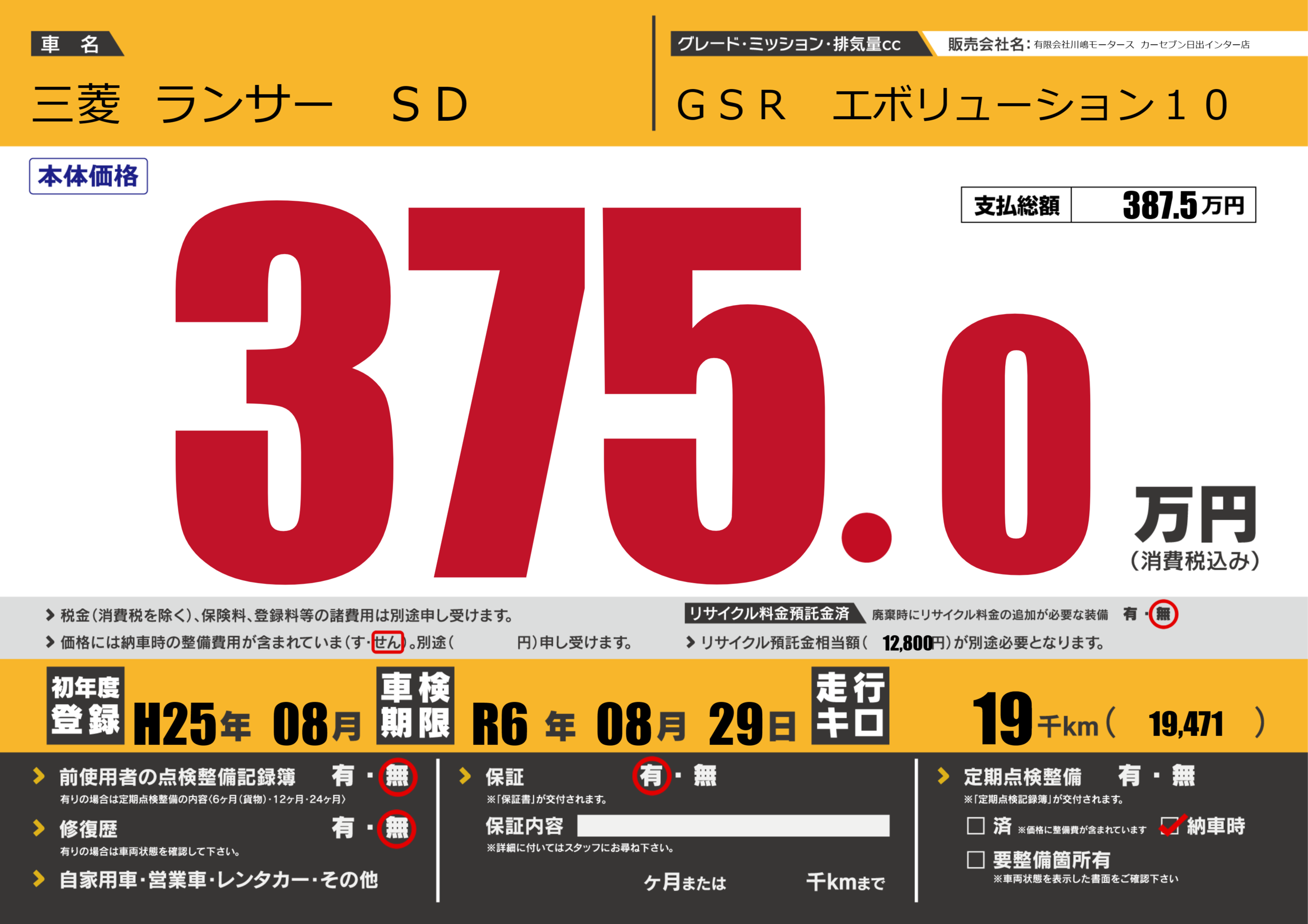 | 車名 | 三菱 ランサー SD | グレード ミッション 排気量 |