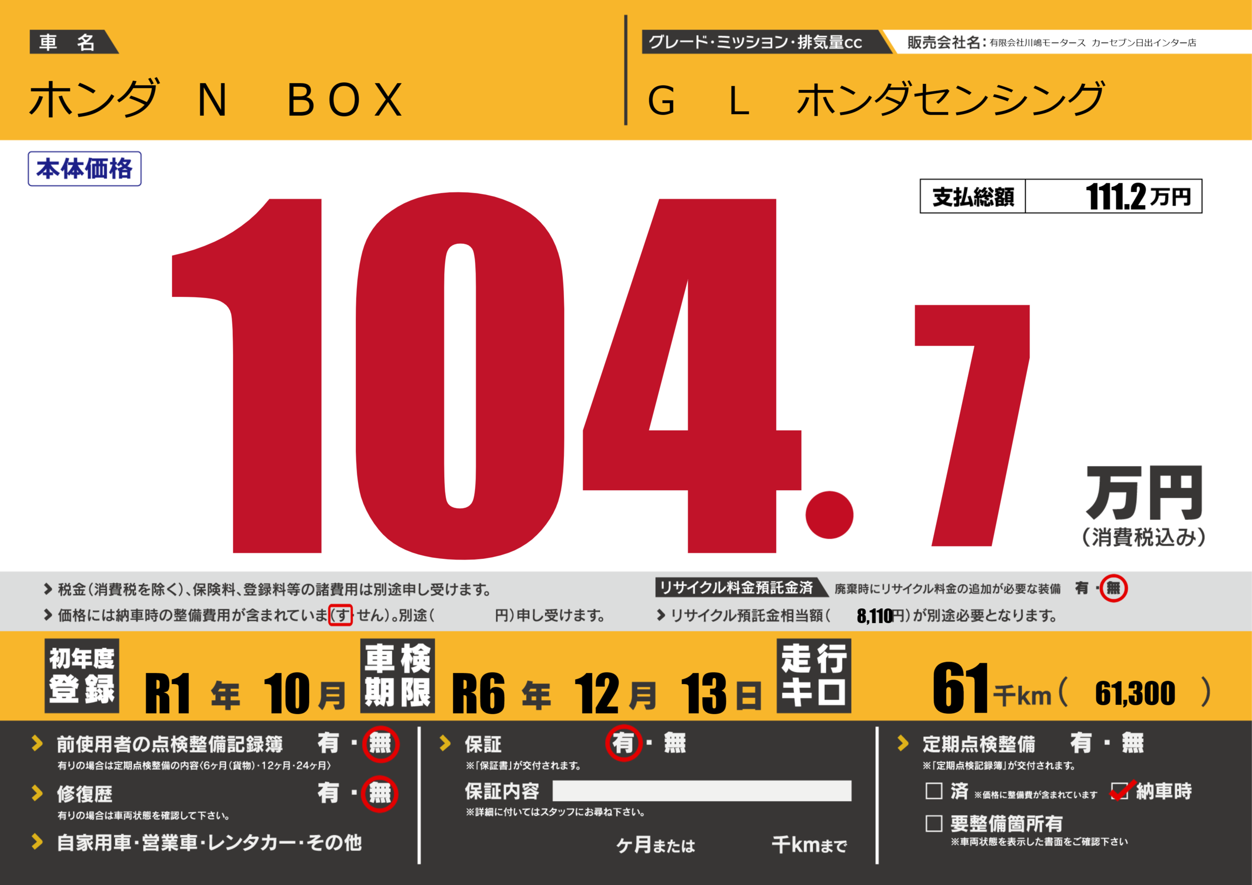 | 車名 | ホンダ N BOX | グレード ミッション 排気量 |