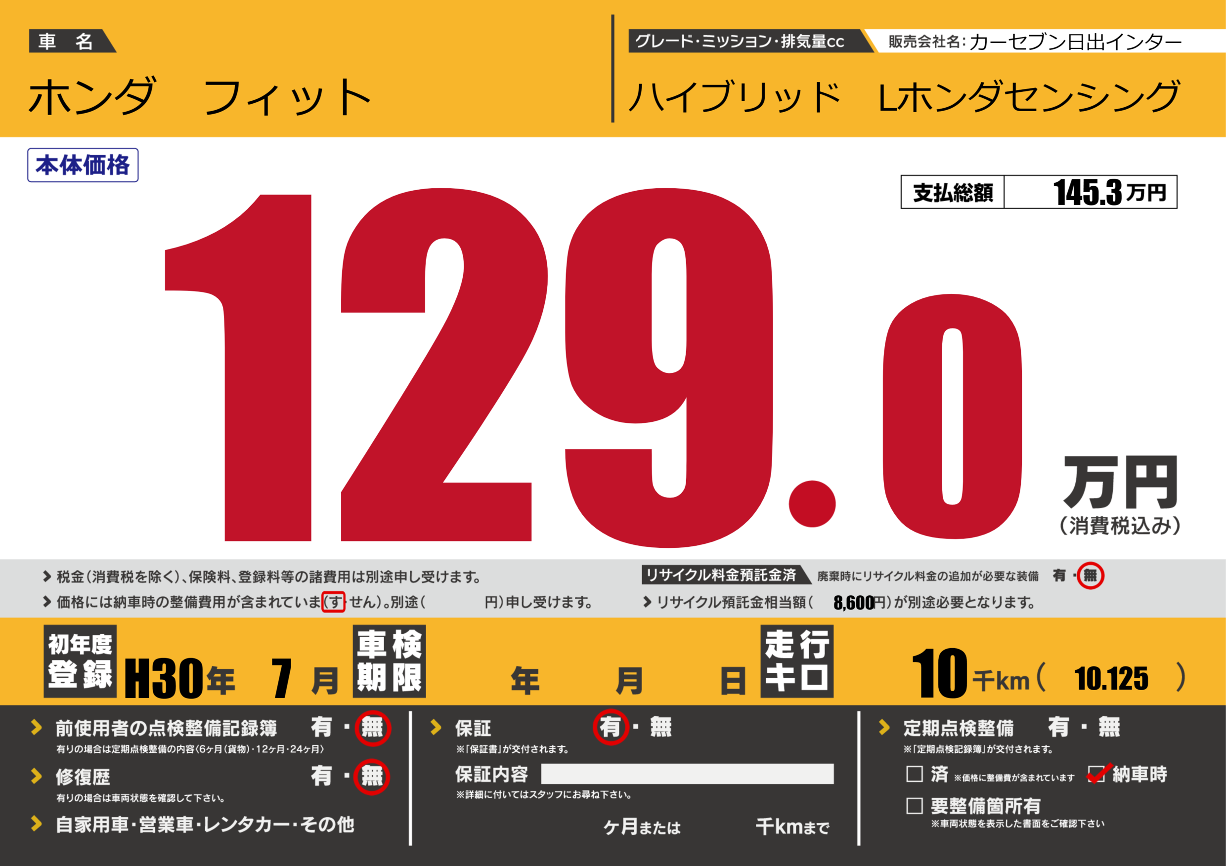 | 車名 | ホンダ フィット | グレード ミッション 排気量 |