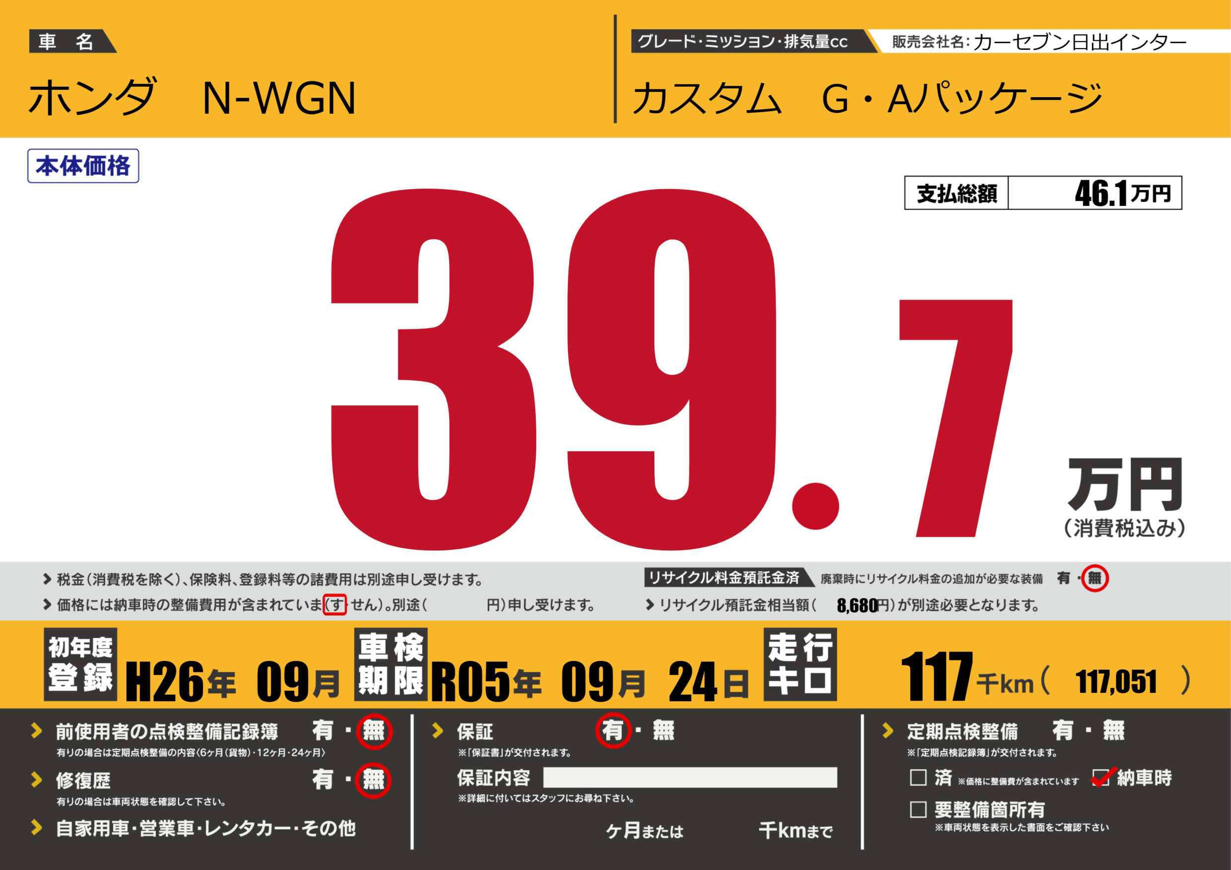 | 車名 | ホンダ N-WGN | グレード ミッション 排気量 |