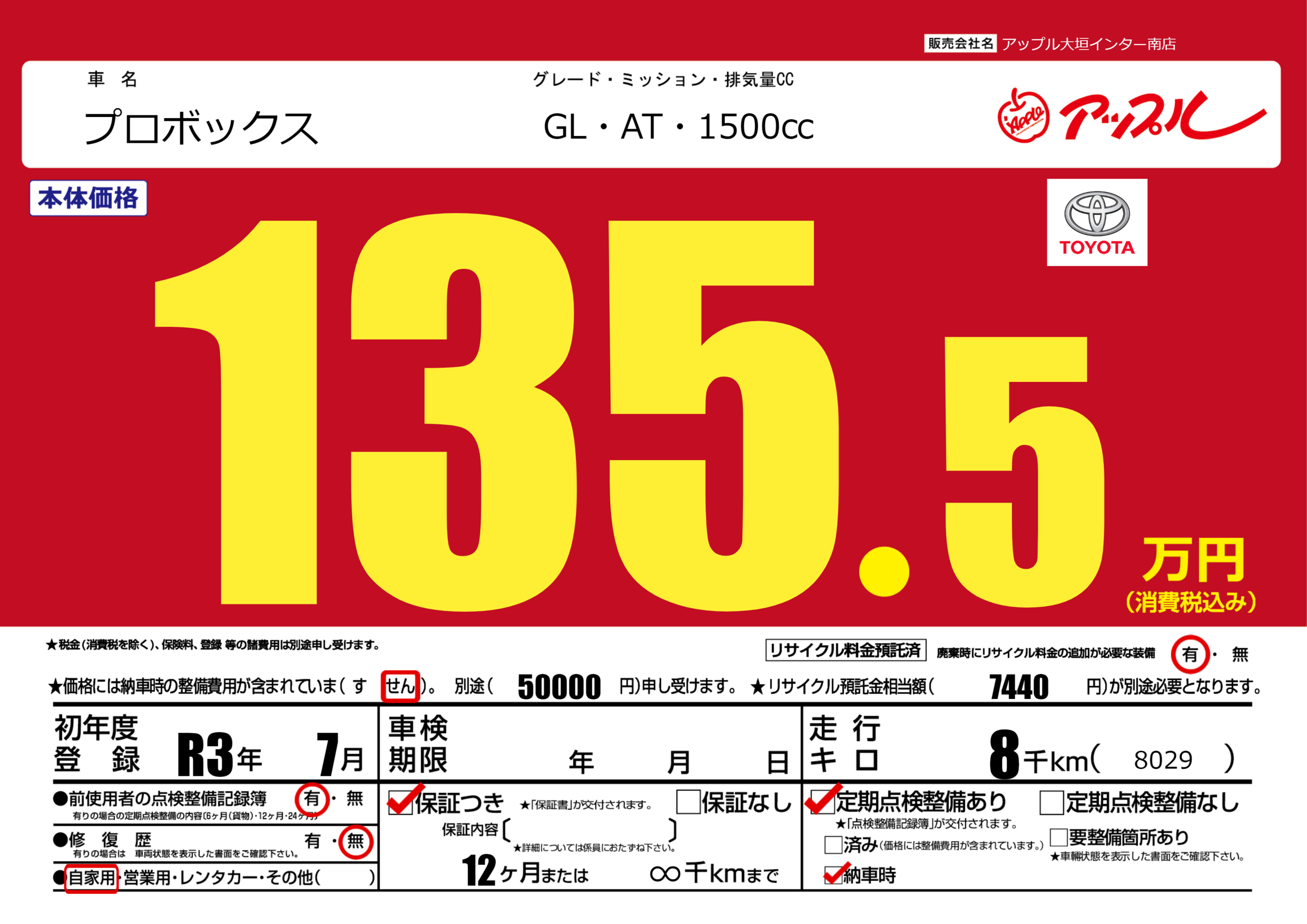 | 車名 | プロボックス | グレード ミッション 排気量 |