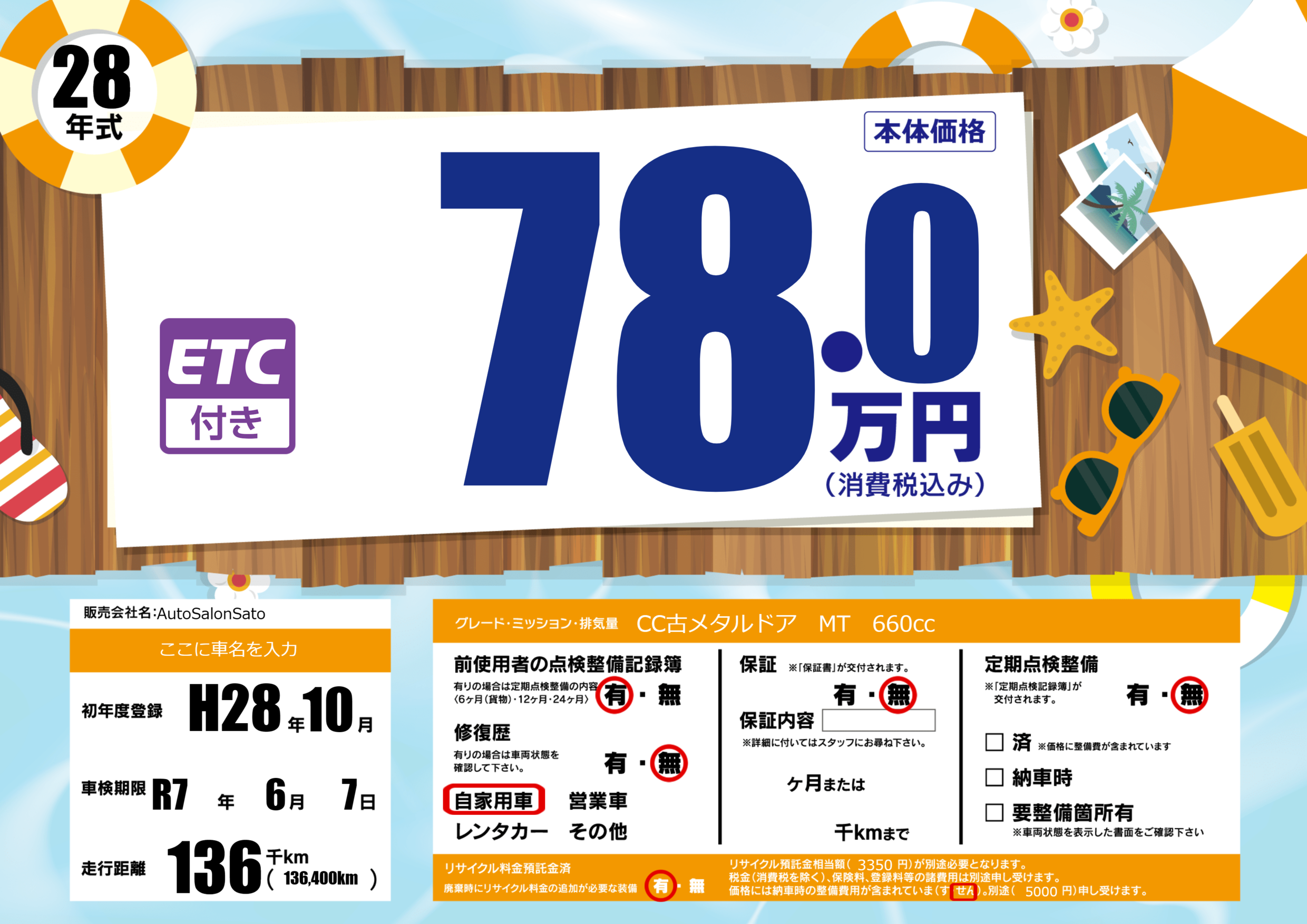| 走行キロ | 13.6万km | 初年度登録 | H28年10月 |