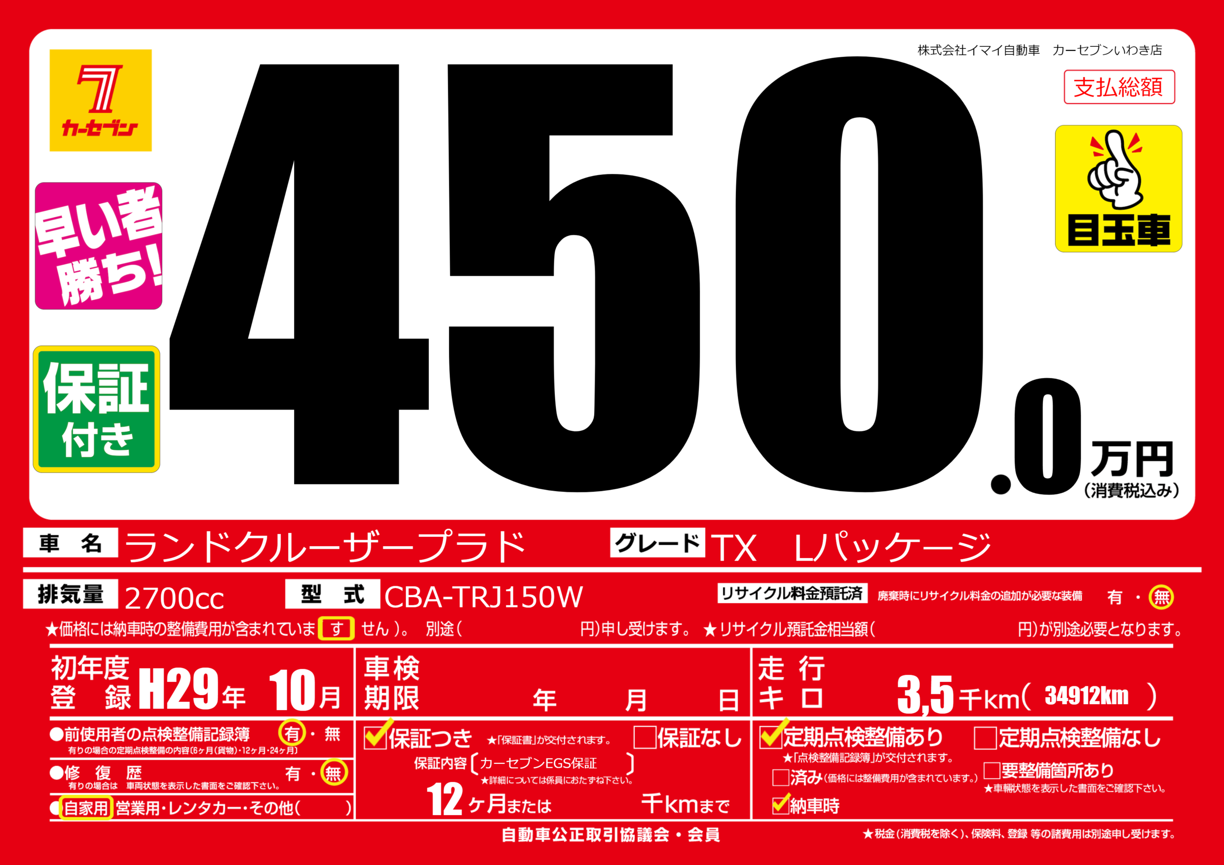 | 車名 | ランドクルーザープラド | グレード ミッション 排気量 |