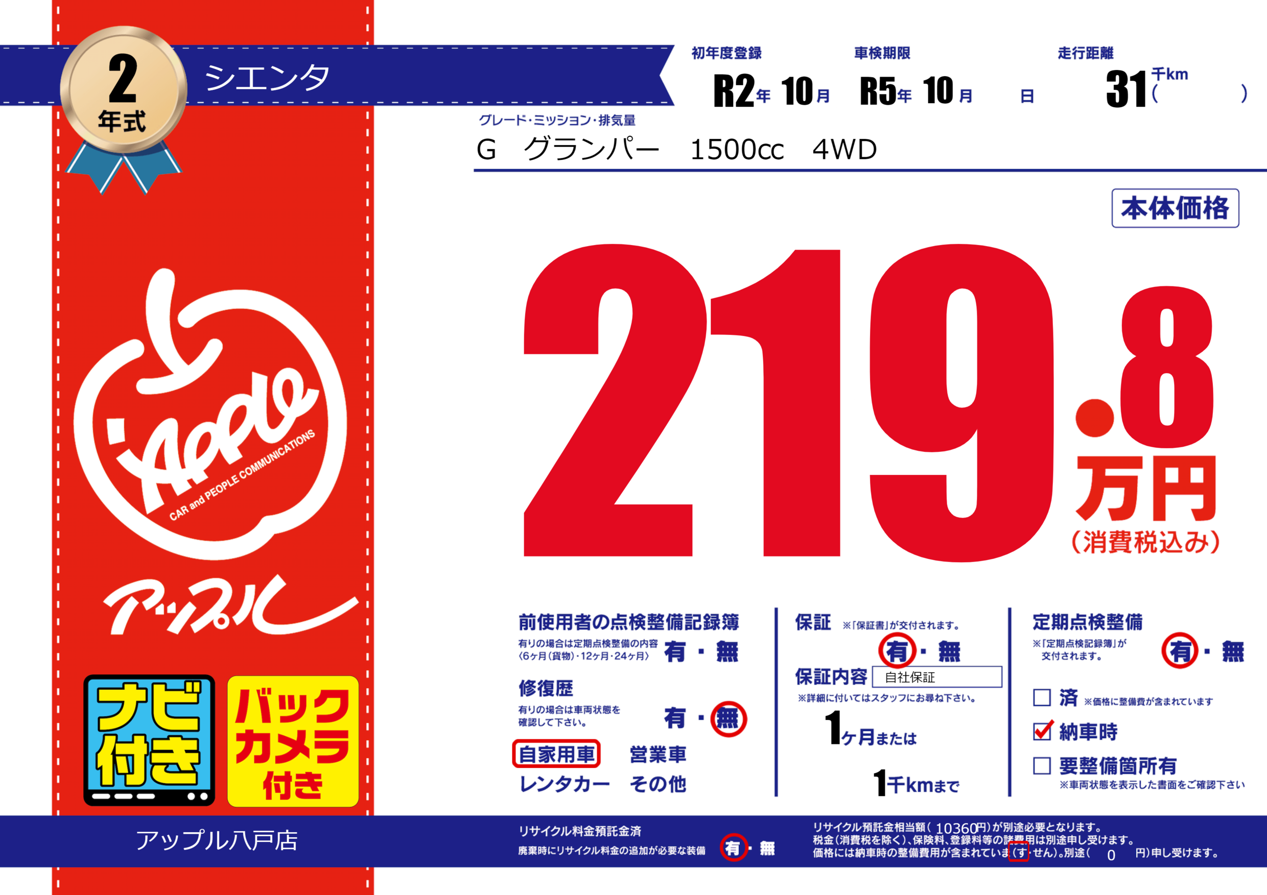 保証付き 保証内容( 自社保証) 1ヶ月または(1)千kmまで |
