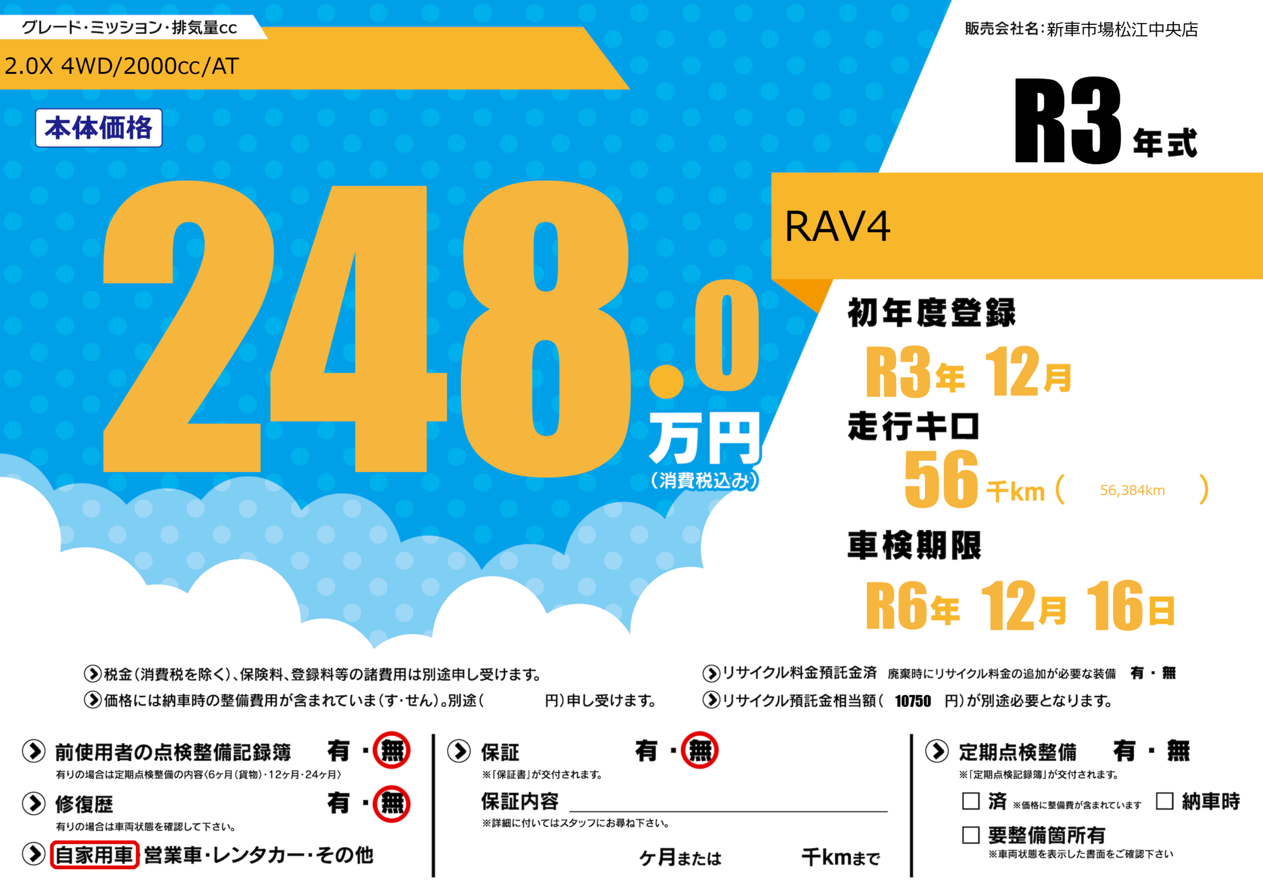 | 車名 | RAV4 | グレード ミッション 排気量 |