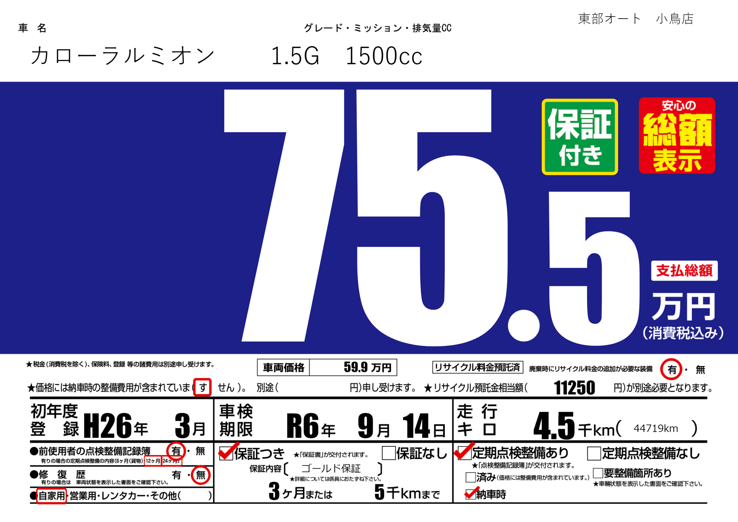 保証付き 保証内容( ゴールド保証) 3ヶ月または(5)千kmまで |