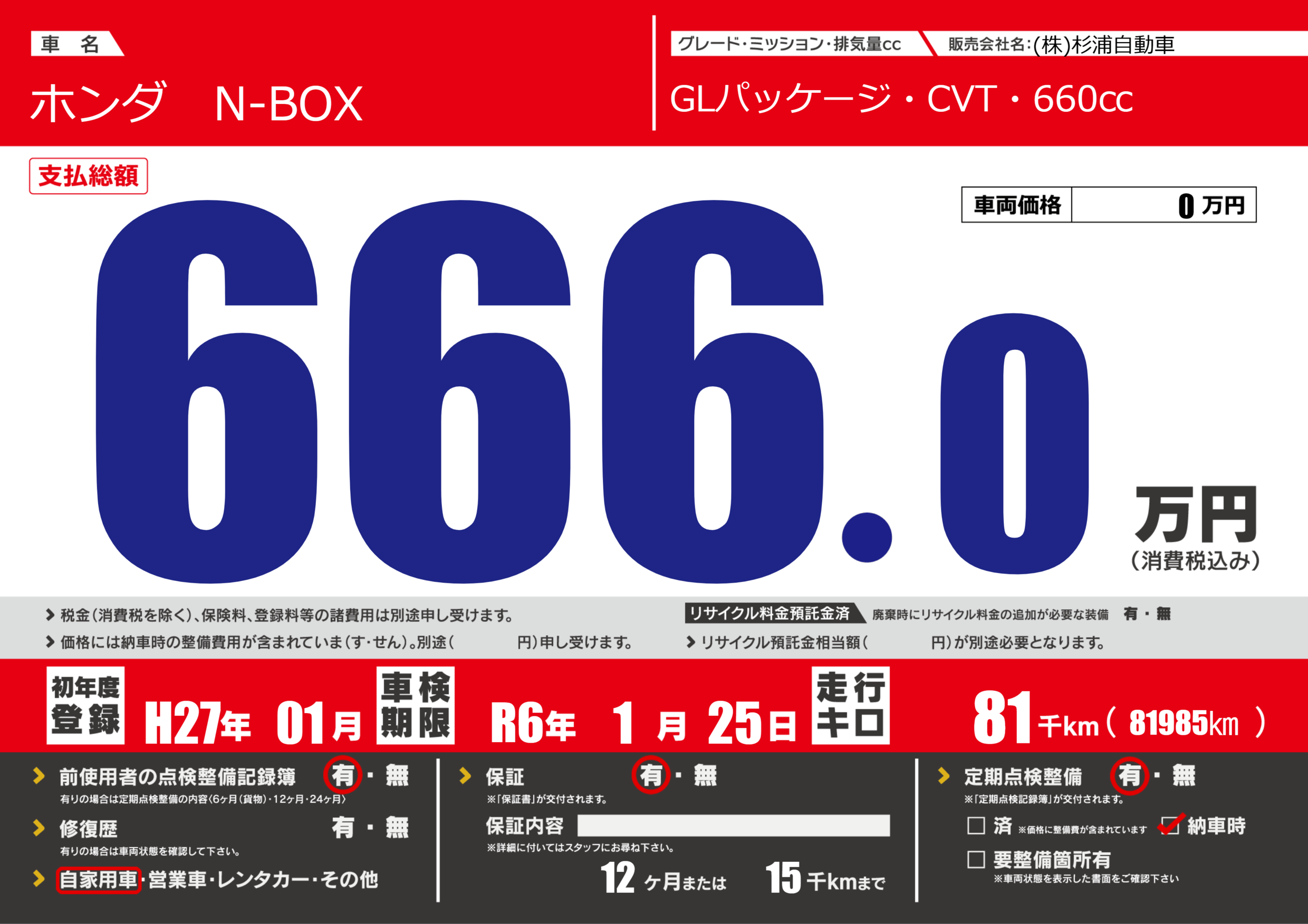保証付き 保証内容(---) 12ヶ月または(15)千kmまで |