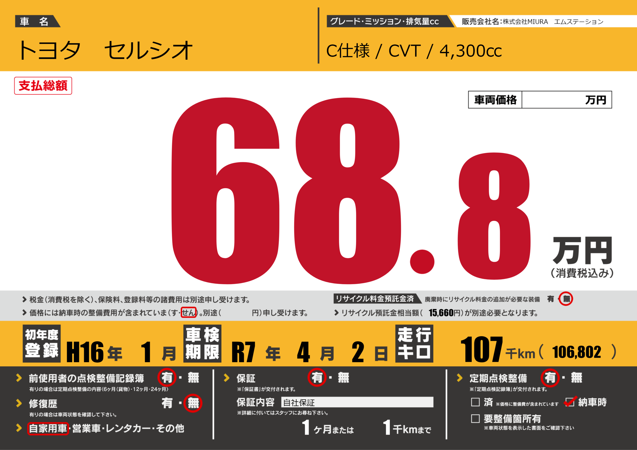| 車検制限 | R7年 4月 2日 | ||