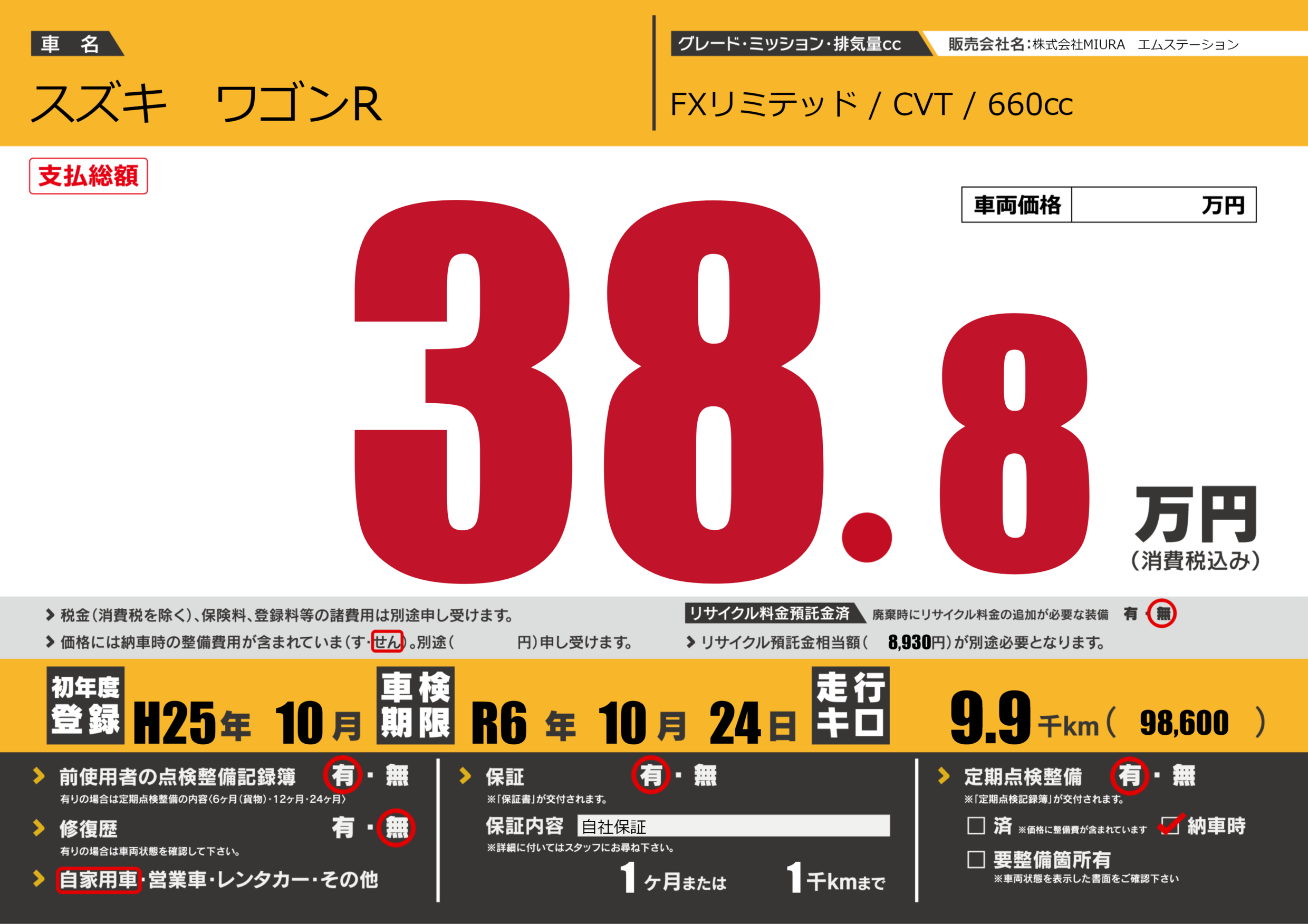 | 車名 | スズキ ワゴンR | グレード ミッション 排気量 |