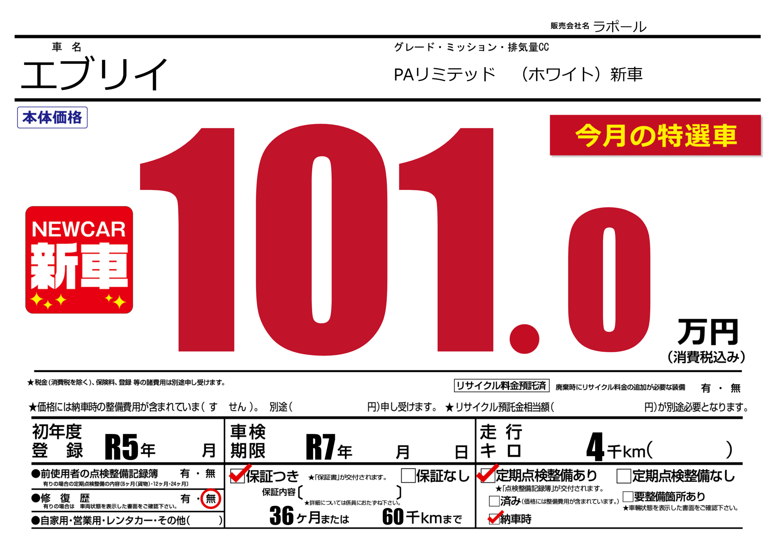 | 車検制限 | R7年 - 月 - 日 | ||