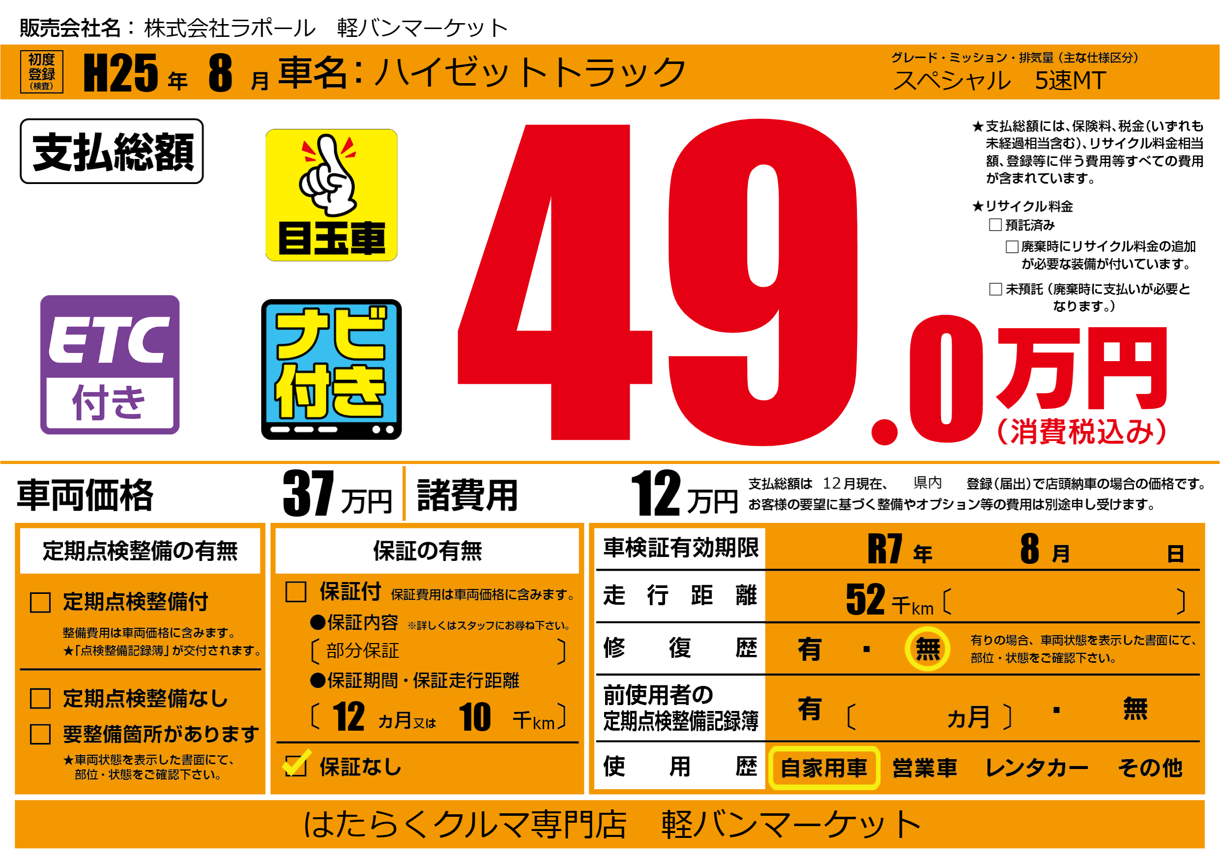 なし | 車検制限 | R7年8月---月 |
