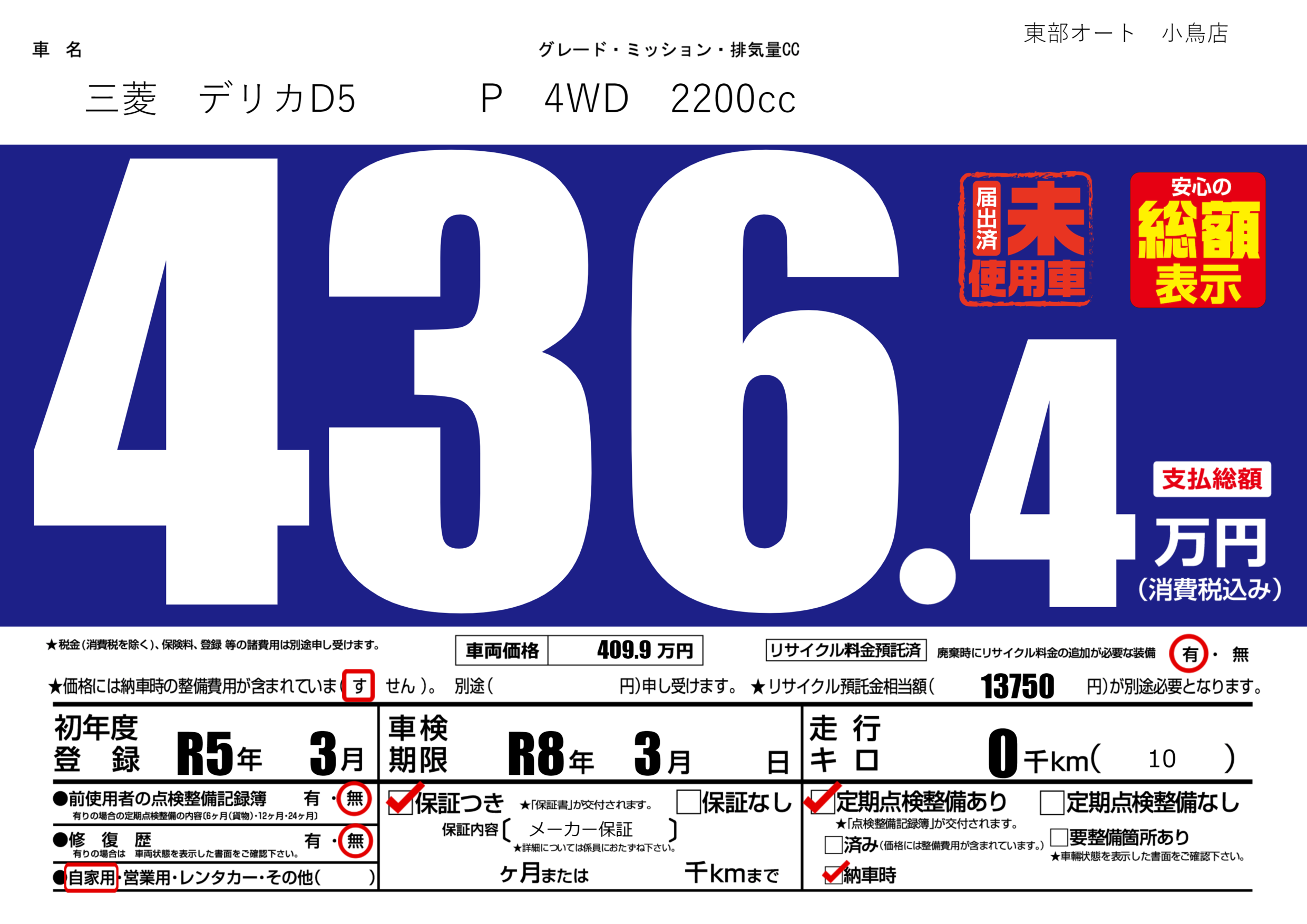 | 定期点検整備 | 定期点検整備あり 納車時あり | ||