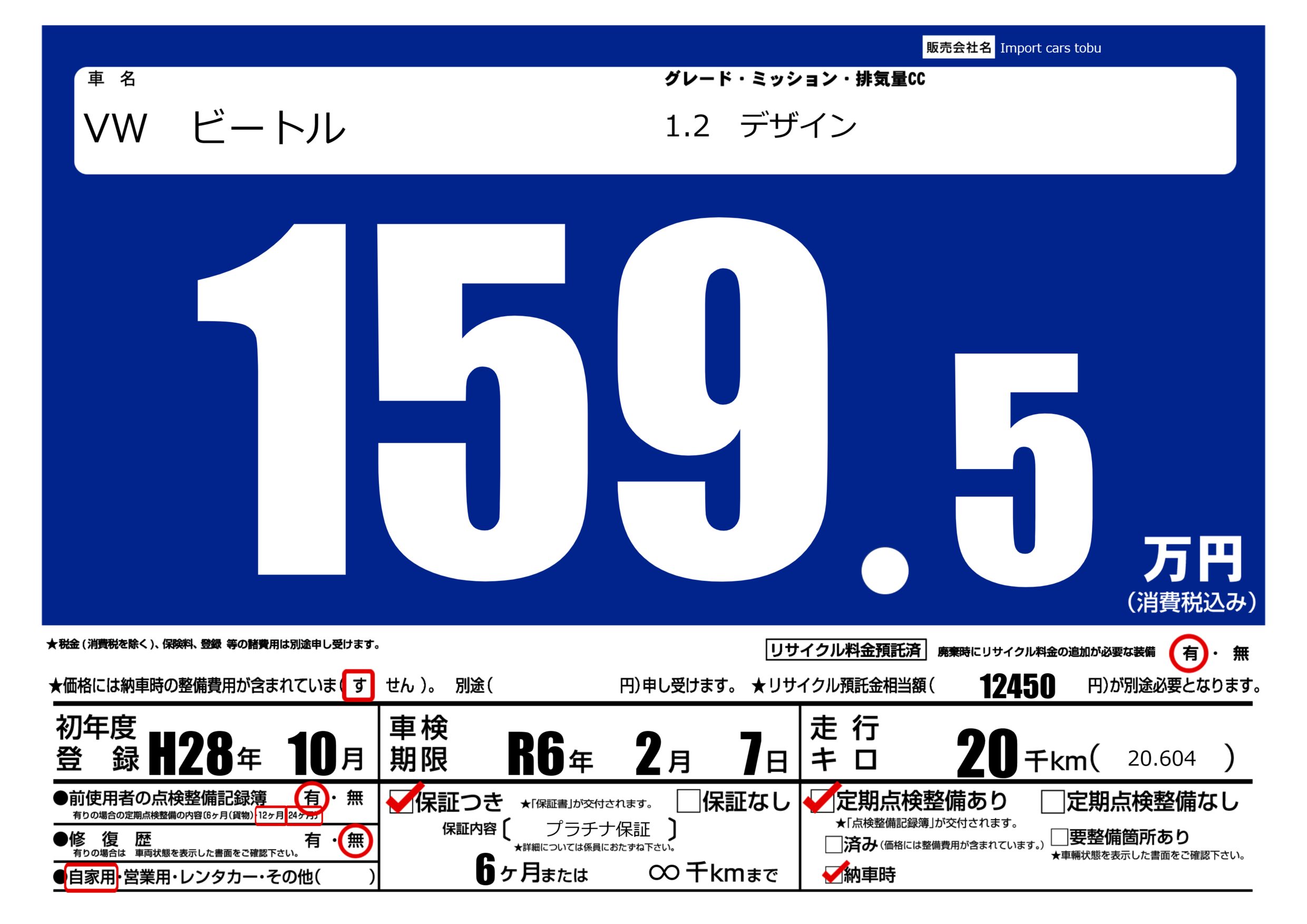 | 車名 | VW ビートル | グレード ミッション 排気量 |