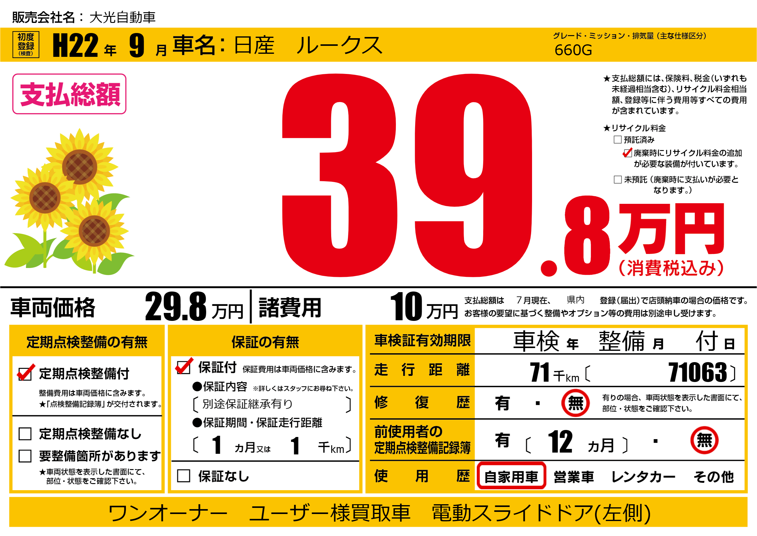 | 走行キロ | 7.1万km | 初年度登録 | H22年9月 |